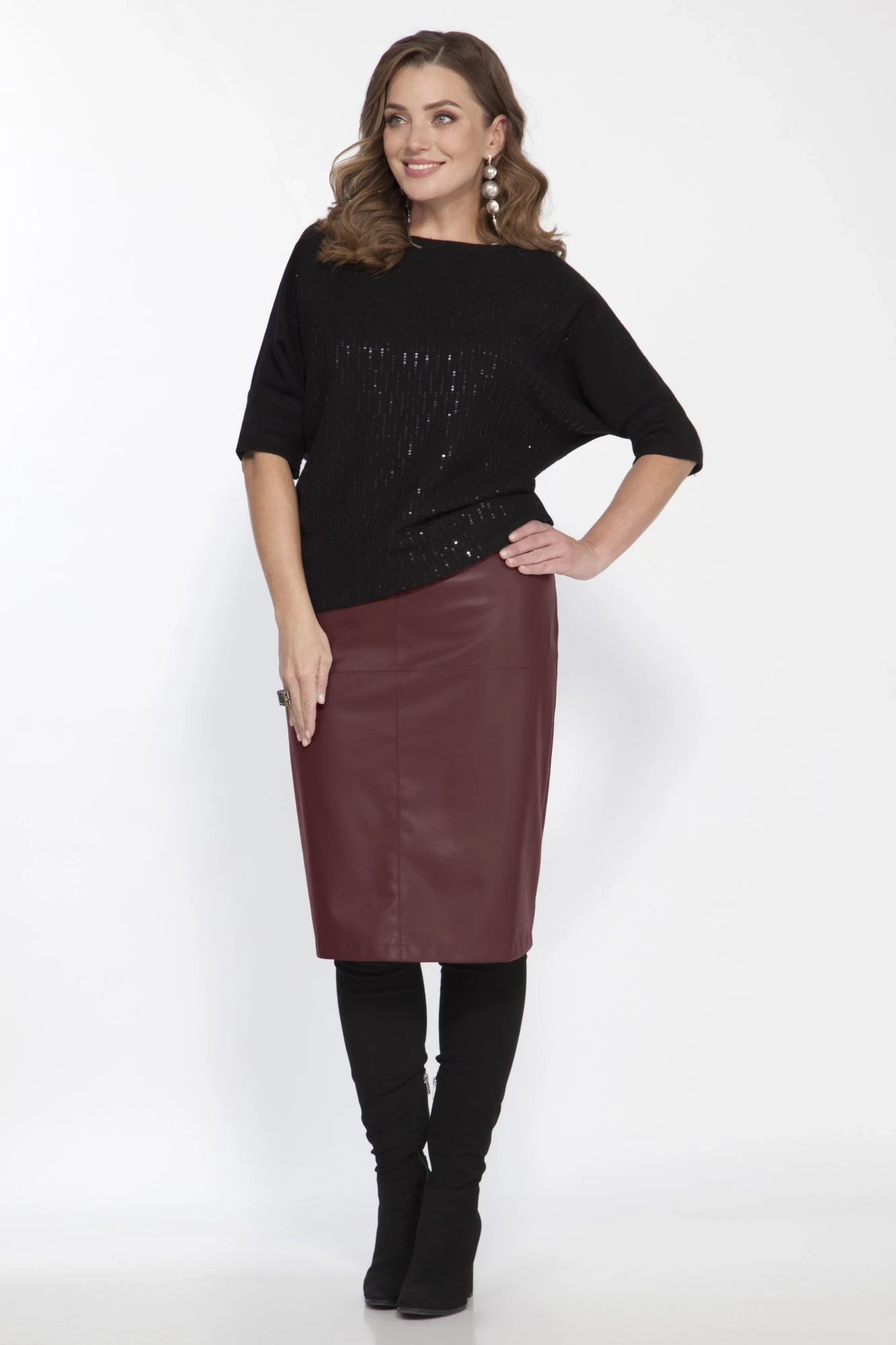 Юбка женская прямого силуэта из экокожи на замшевой основе. Пояс на обтачке из декоративной эластичной тесьмы. Перед юбки с крестообразным сечением из четырех деталей. Спинка на застежке молния в среднем шве, переходящем в шлицу.