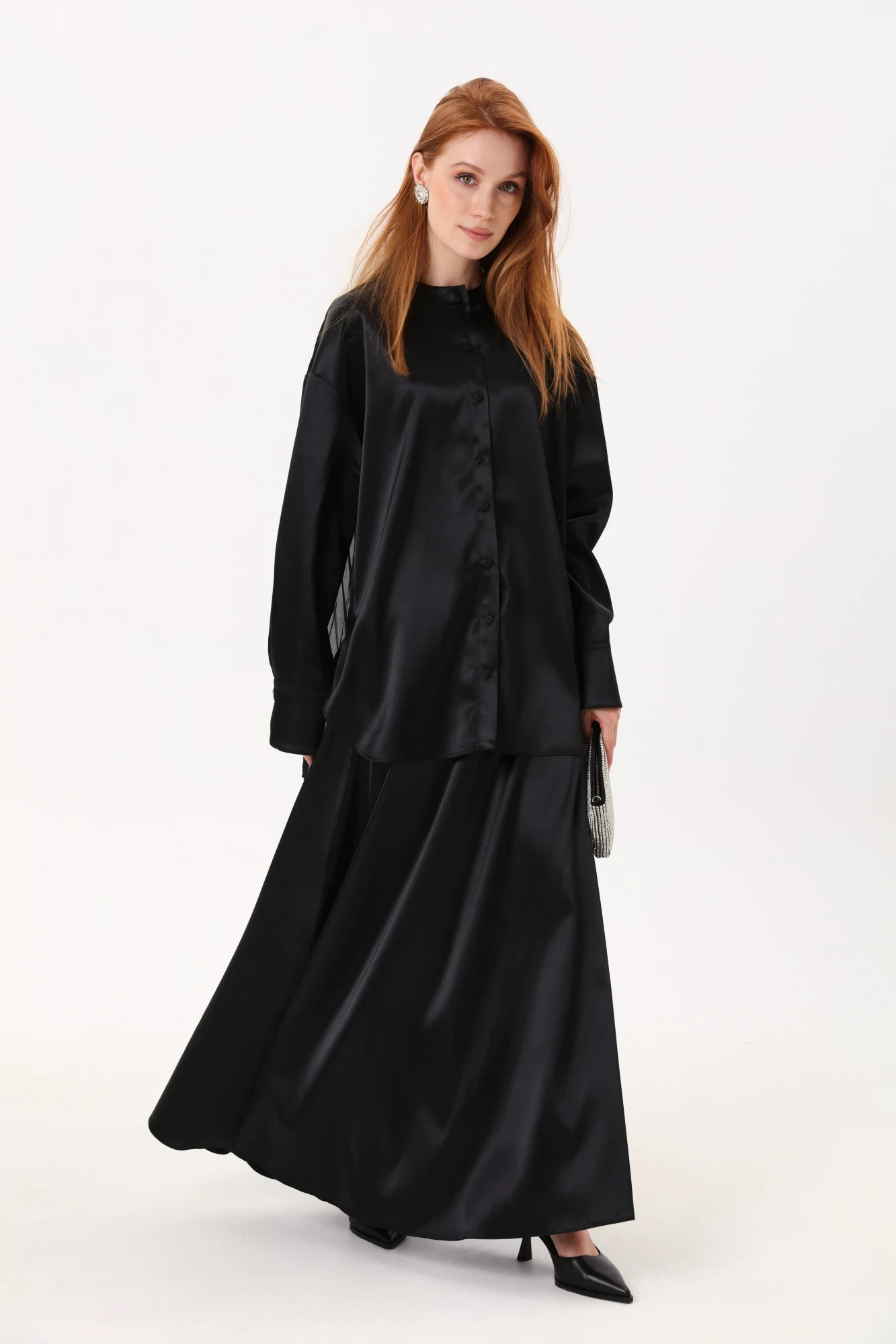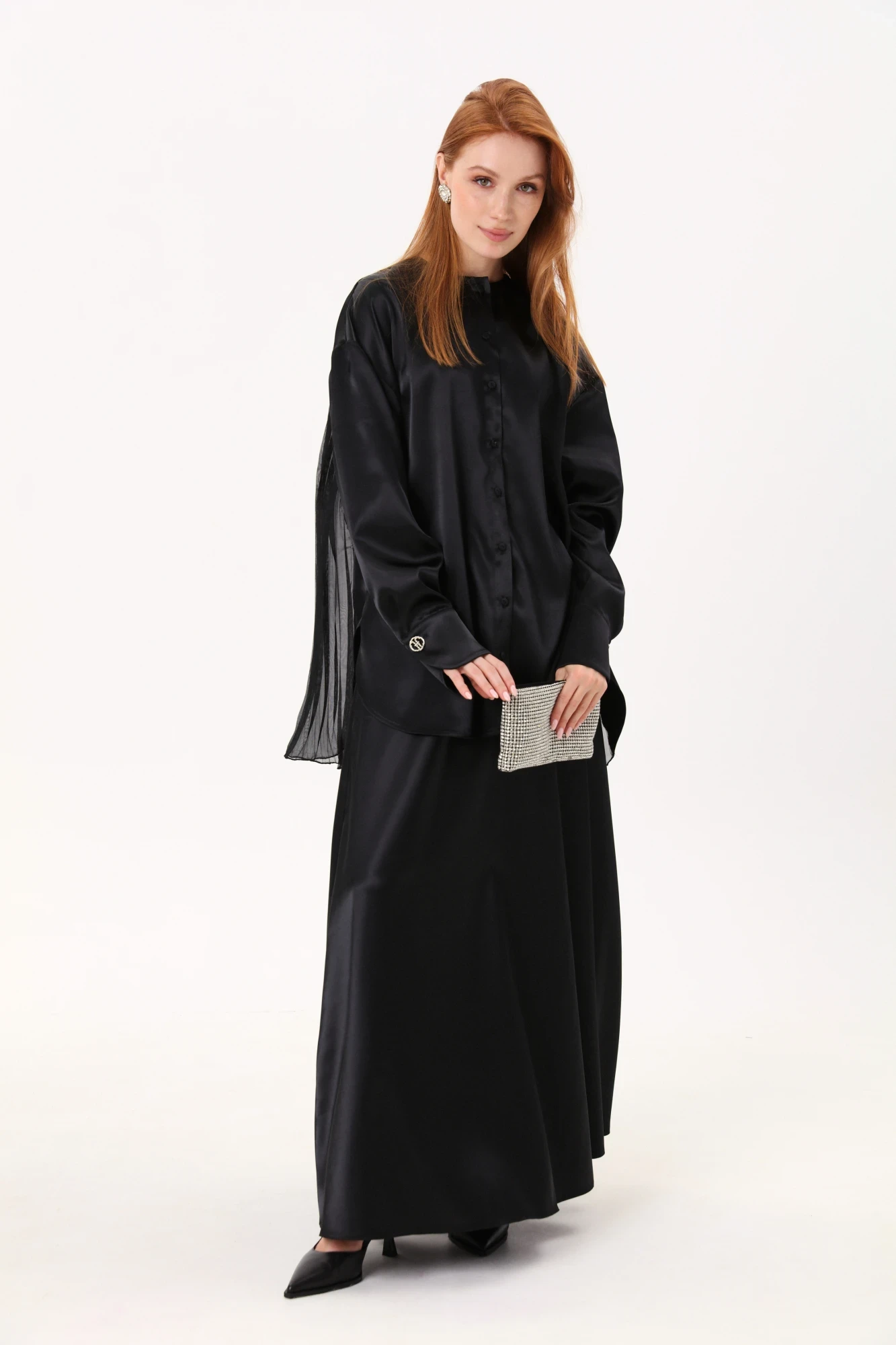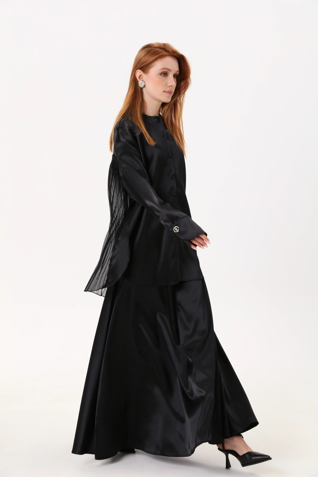 Юбка - солнце макси с узким поясом. В боковых швах расположены карманы. Застёжка на петлю и пуговицу и молнию по спинке.