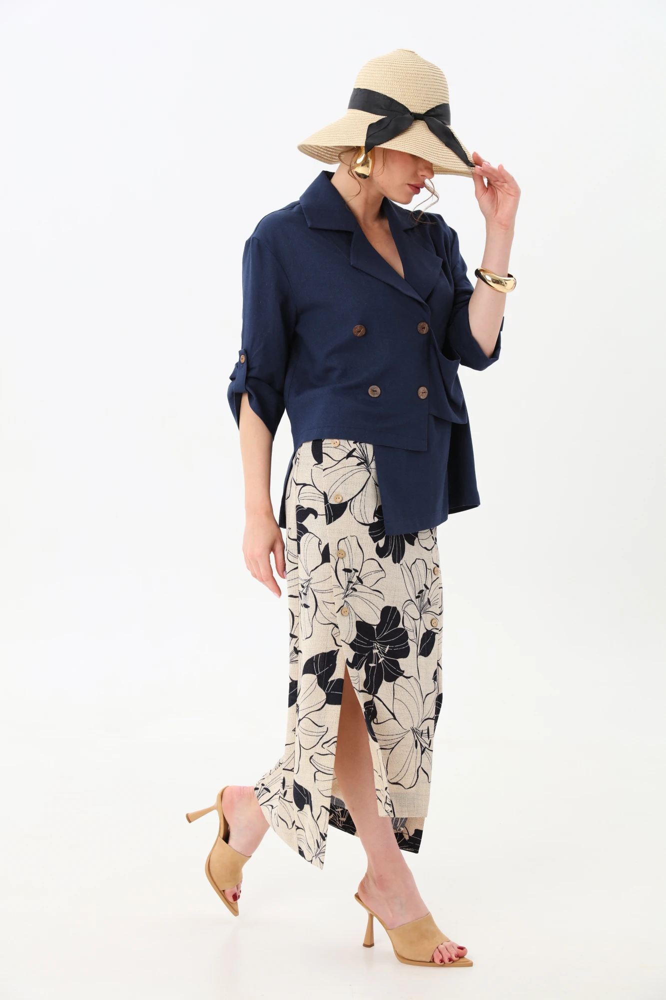 Юбка длиной миди, расклешенная к низу, с асимметричным низом. Пояс притачной, по спинке собран на резинку. Переднее полотнище состоит из трех частей. Правая часть скреплена отделочной строчкой и кнопками. В боковых швах изделия расположены карманы. По спинке изделия идёт средний шов и две вытачки для удачной посадки по фигуре. Юбка без подкладки.