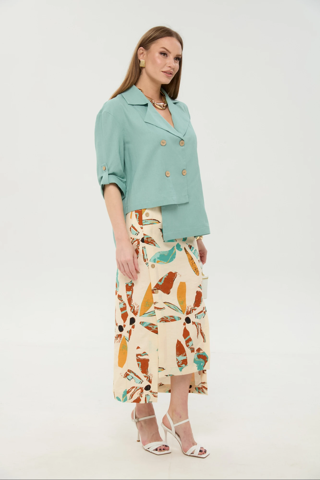 Юбка длиной миди, расклешенная к низу, с асимметричным низом. Пояс притачной, по спинке собран на резинку. Переднее полотнище состоит из трех частей. Правая часть скреплена отделочной строчкой и кнопками. В боковых швах изделия расположены карманы. По спинке изделия идёт средний шов и две вытачки для удачной посадки по фигуре. Юбка без подкладки.