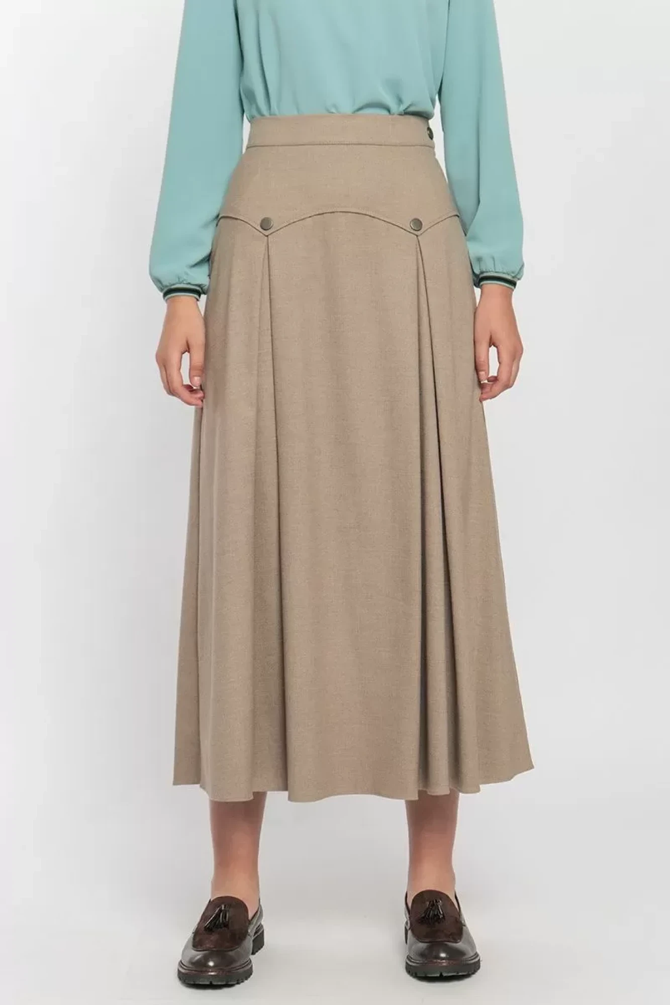 Юбка длиной миди в приятном бежевом цвете подойдёт для создания спокойных аутфитов.