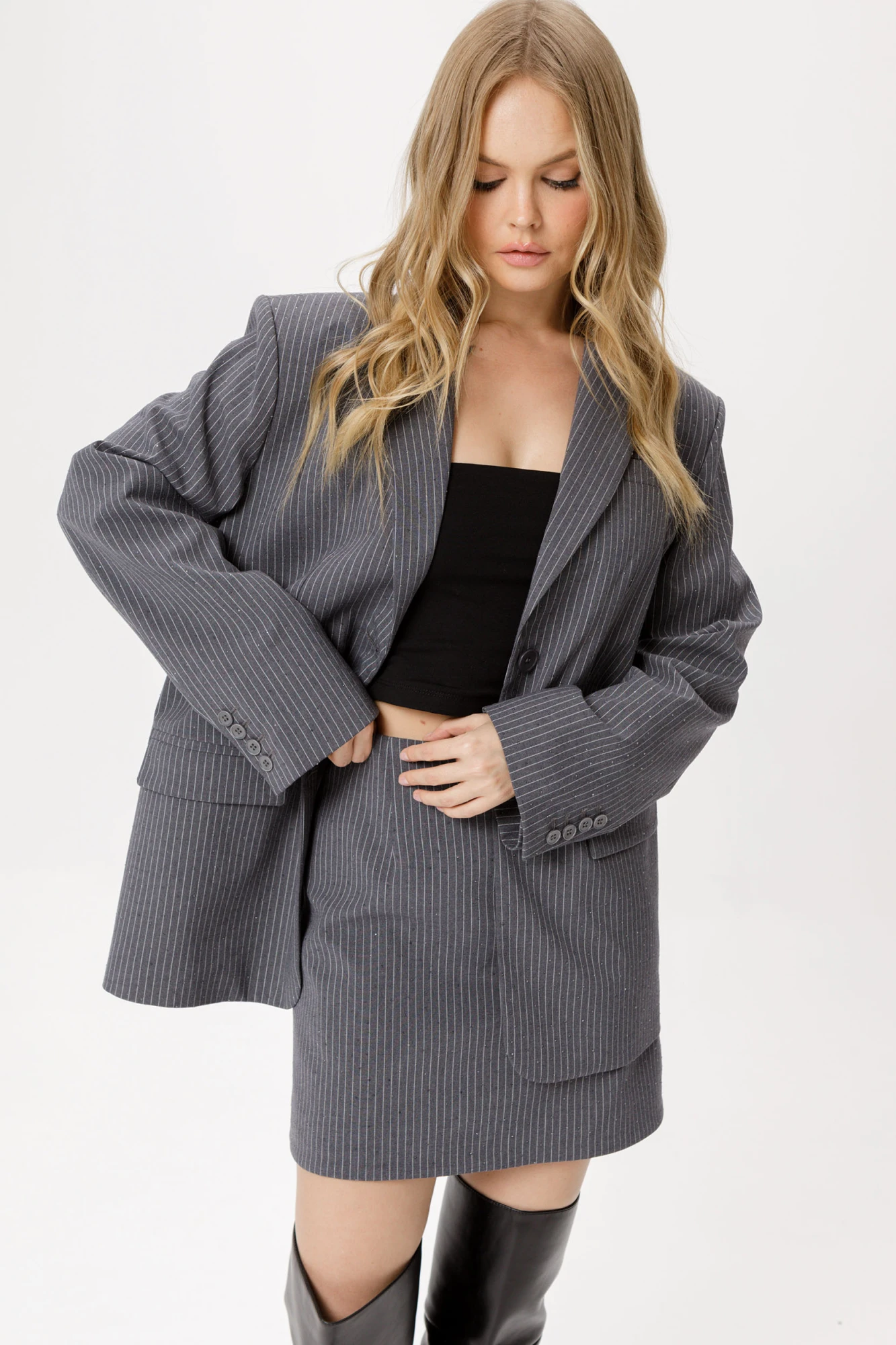Мини-юбка из текстильной ткани в тонкую полоску со стразами.