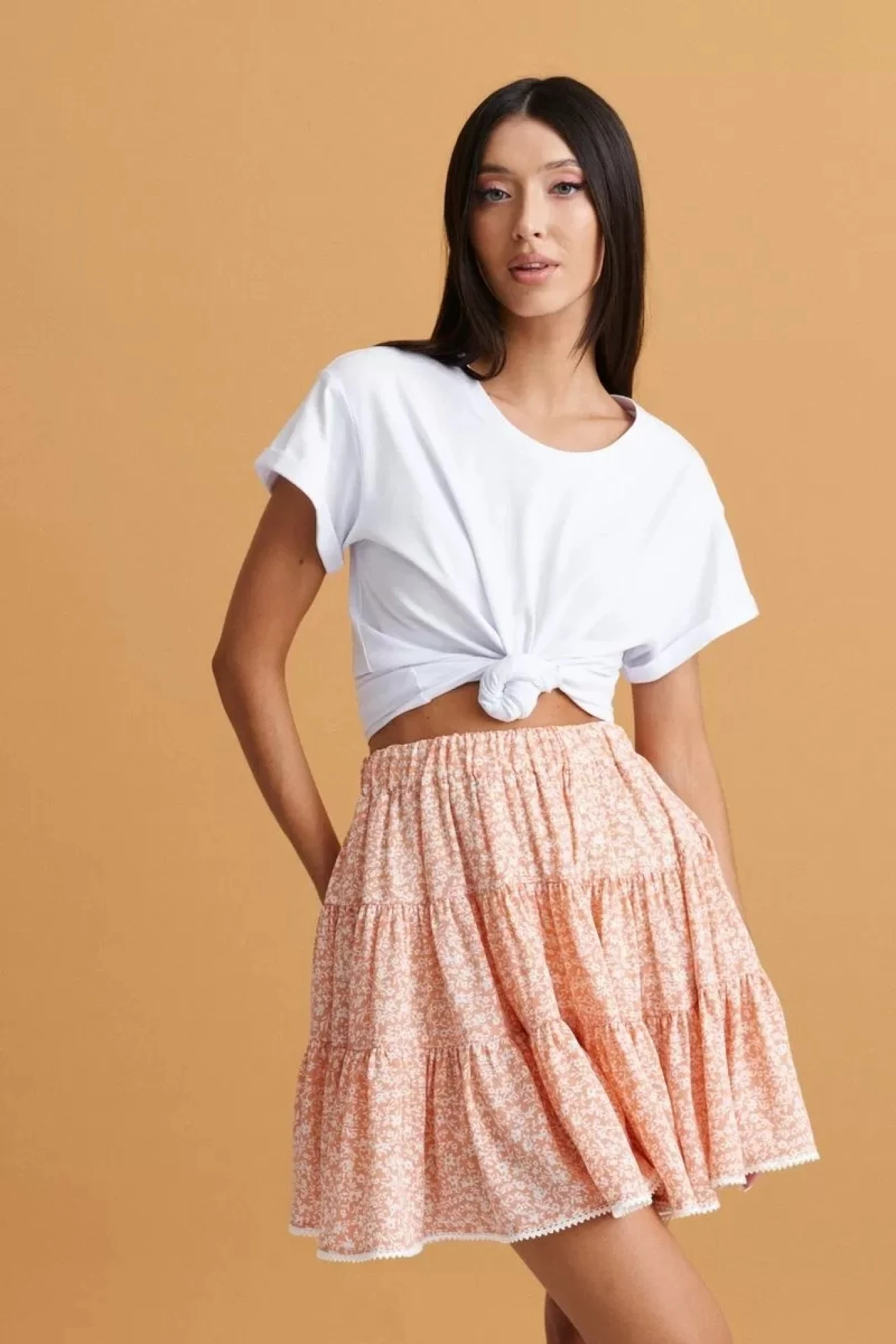 Юбка полуприлегающего силуэта выполнена тремя ярусами с миниатюрным кружевом по низу, персиковый цвет полотна с цветочным принтом. Характеристики: полуприлегающий силуэт, подкладка, пояс на эластичной резинке, по низу изделия миниатюрное кружево. Длина изделия по боковому шву 47 см.
