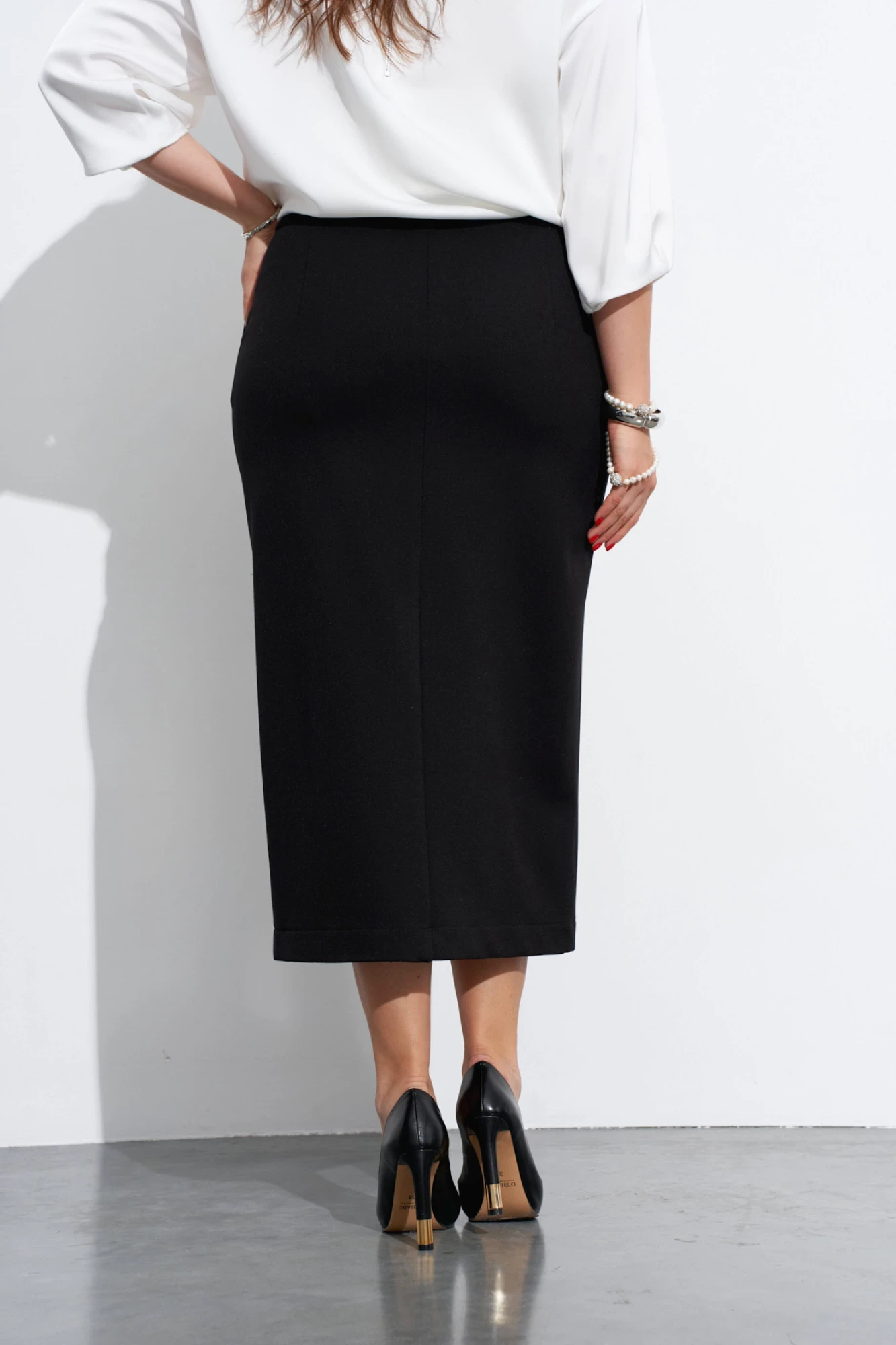 "Юбка прямого силуэта. Спереди обработан средний шов со шлицей в низу. На передних полотнищах обработаны карманы с косым входом и застёжка на молнию. Верх юбки на притачном поясе со шлёвками и эластичной тесьмой. Изделие на подкладке.