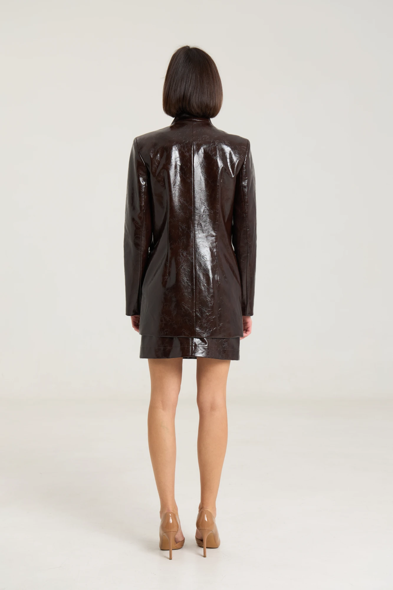 "Юбка прилегающего силуэта на притачном поясе, посадка высокая , юбка на подкладке, изделие имеет центральный шов спереди и сзади. В среднем шве застежка на потайную молнию. Юбка выполнена из плотной лаковой экокожи шоколадного цвета.