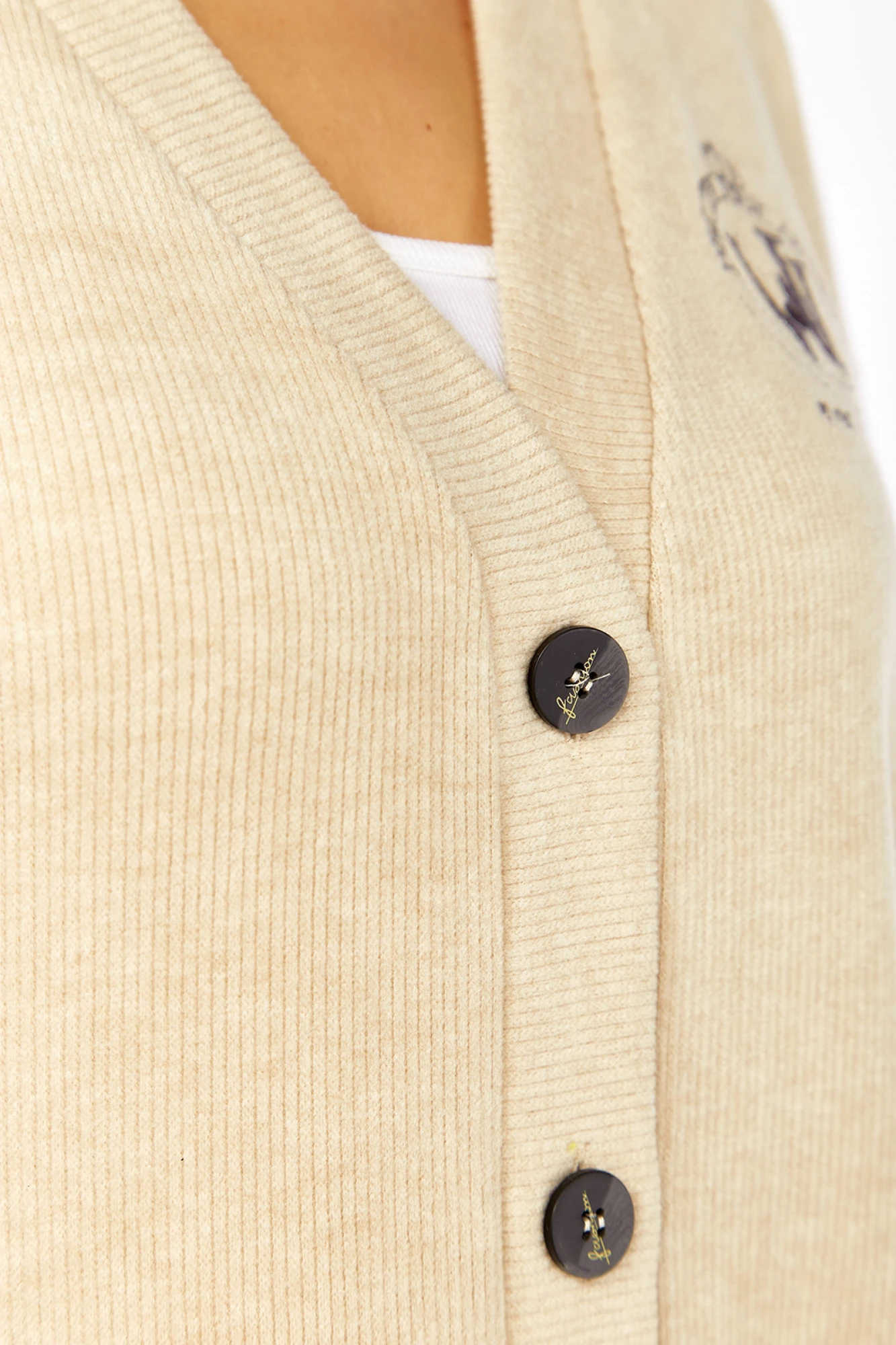 Кардиган женский, изготовлен из трикотажного полотна. Горловина V-образной формы, застежка отрезная планка на петли и пуговицы. Карманы с листочками. По низу изделия и низу рукавов-декоративные довязы. Спинка цельнокроенная. Рукава спущенные длинные. Отделочный элемент — вышивка на детали переда.