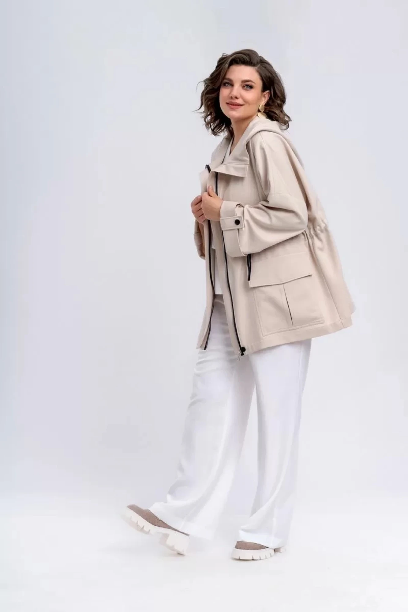 "Куртка - жакет свободнонго силуэта без подкладки. Попереду накладные карманы с клапаном,полинии талии кулиса. Застежкана молнию с клапанами. Воротник-копюшон. Рукав со спущеной линии плеча,заканчивается отложной манжетой с патой. Отделкой служит шиврон,шнур и пуговицы.