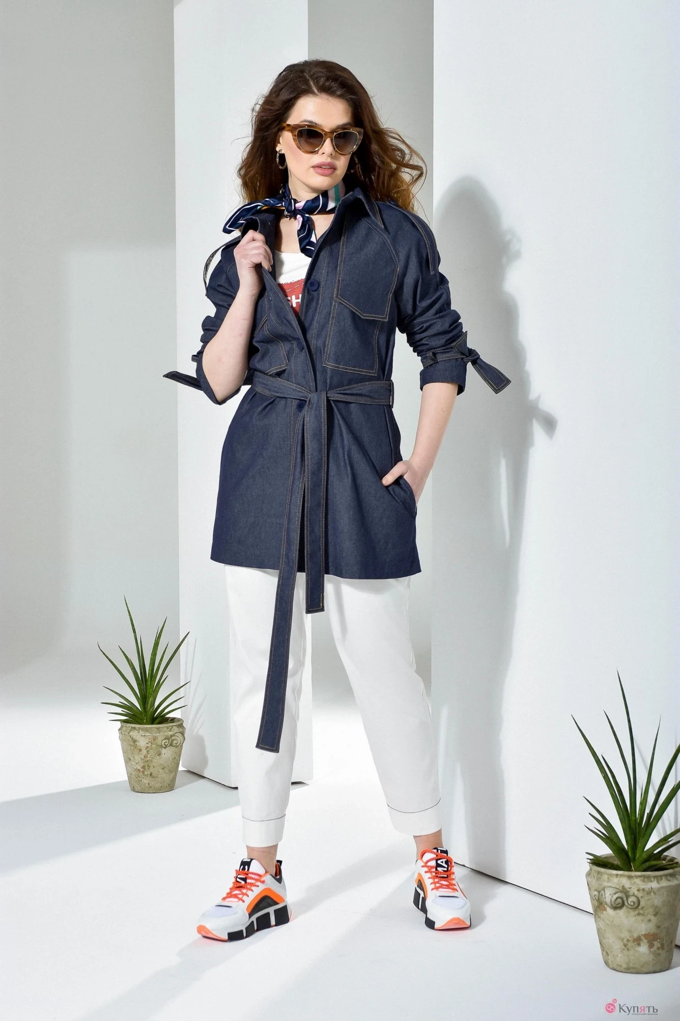 Куртка из джинсовой ткани прямого силуэта без подкладки, застёгивающаяся на пуговицы. Внутренние швы окантованы. Отлетная кокетка сзади. Передняя кокетка переходит в клапаны для накладных карманов на груди. Карманы в боковых швах. Декоративные погоны, завязывающиеся паты на рукавах и пояс отстрочены контрастной гарусной нитью.