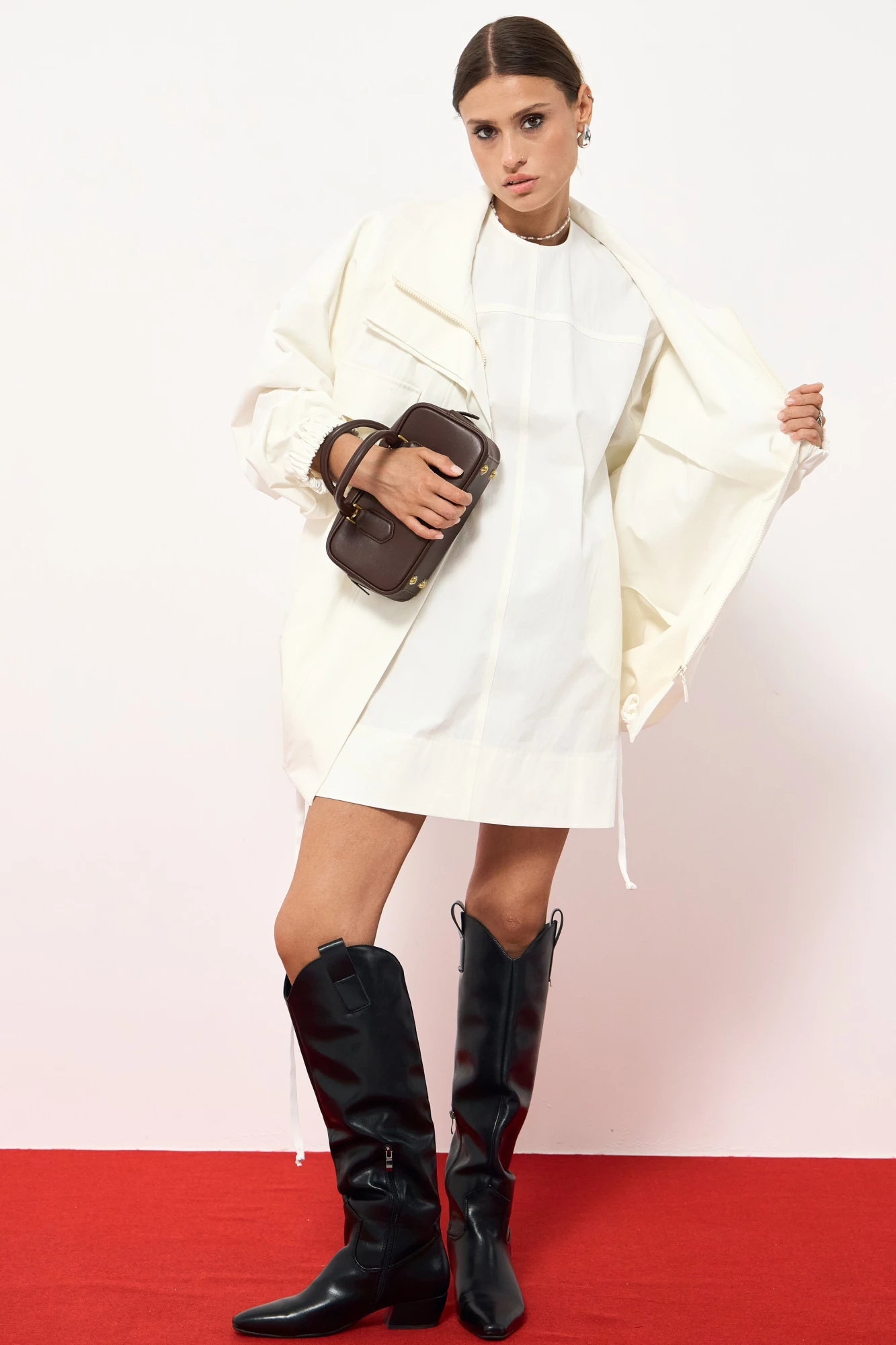 Куртка из хлопковой ткани, большого объема, со спущенной линией плеча. По переду накладной карман, застежка на молнию и приточную планку на пуговицах. Рукав одношевный, низ обработан эластичной тесьмой. По низу куртки кулиса с декоративным шнурком. Воротник стойка. Платье прямого силуэта в длине мини из хлопка. По переду декоративные швы, по бокам функциональные карманы. По спинке застежка на потайную молнию.