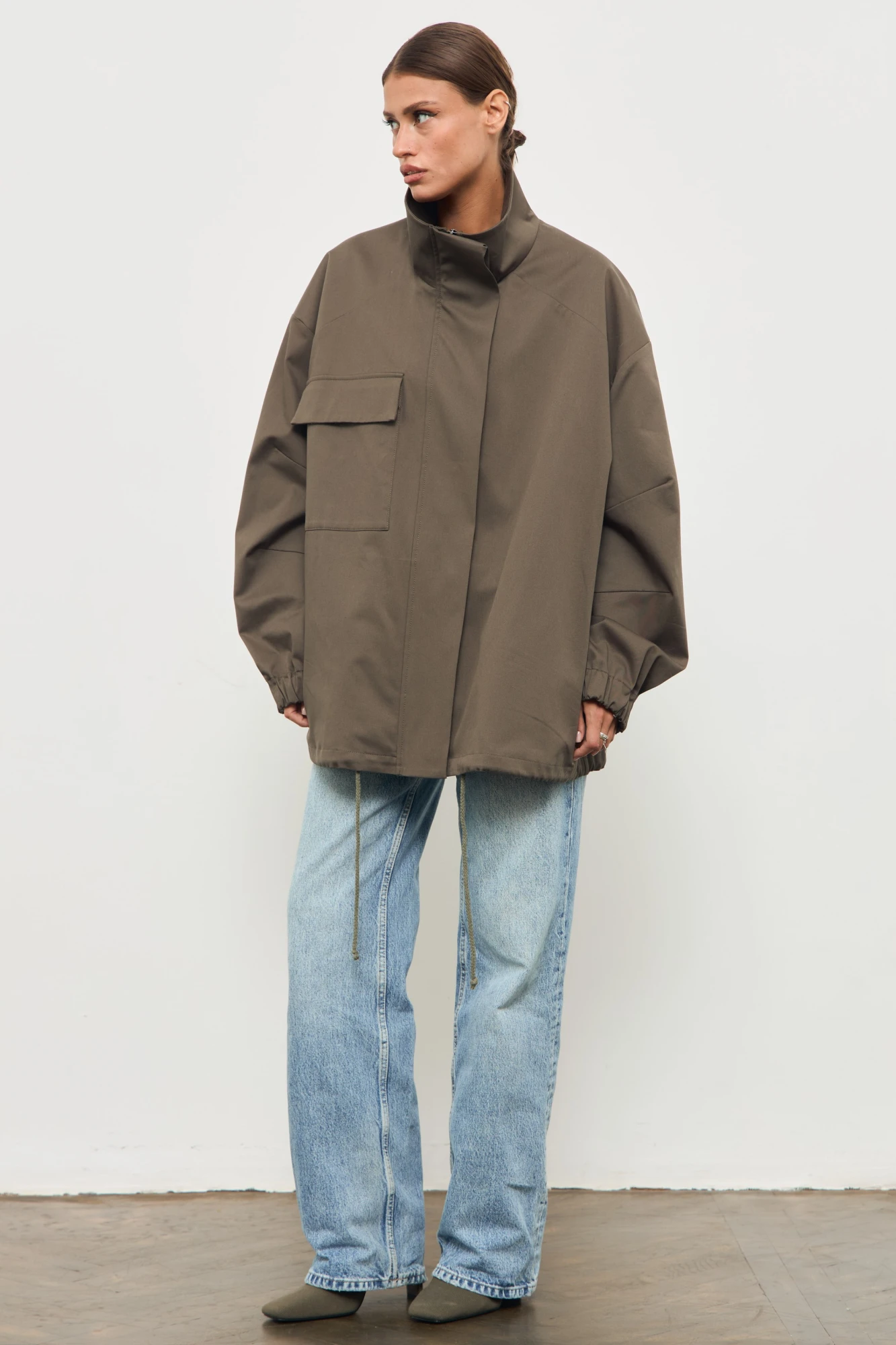 Куртка из хлопковой ткани, большого объема, со спущенной линией плеча. По переду накладной карман, застежка на молнию и приточную планку на пуговицах. Рукав одношевный, низ обработан эластичной тесьмой. По низу куртки кулиса с декоративным шнурком. Воротник стойка.