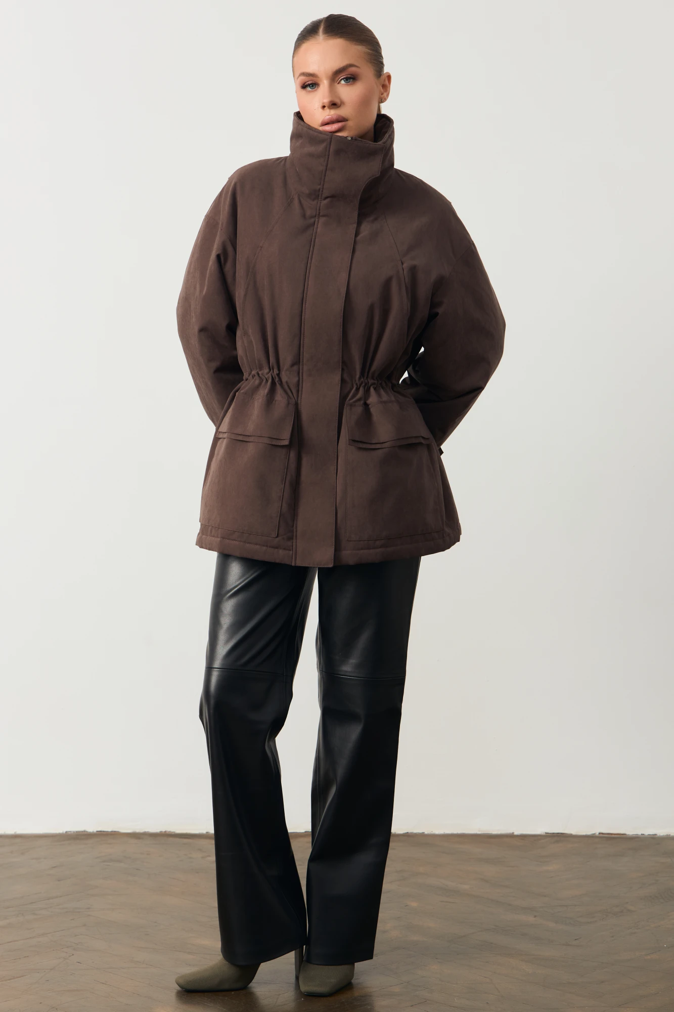 Женская куртка с высоким воротом. На поясе кулиска. Изделие прямого кроя. Состав товара: Полиэстер 100%, Подкладка: Вискоза 53% Полиэстер 47%. Длина изделия 74см; Длина рукава 75см.