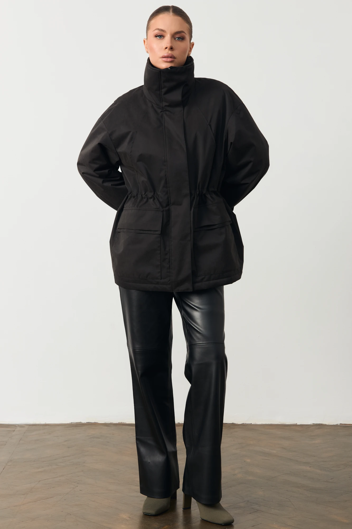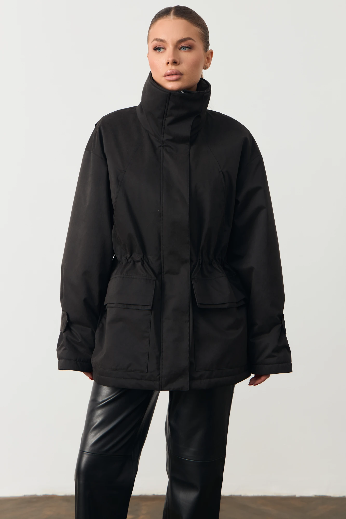 Женская куртка с высоким воротом. На поясе кулиска. Изделие прямого кроя. Состав товара: Полиэстер 100%, Подкладка: Вискоза 53% Полиэстер 47%. Длина изделия 74см; Длина рукава 75см.