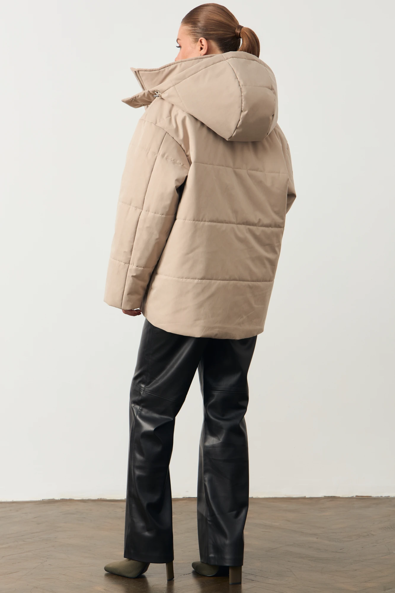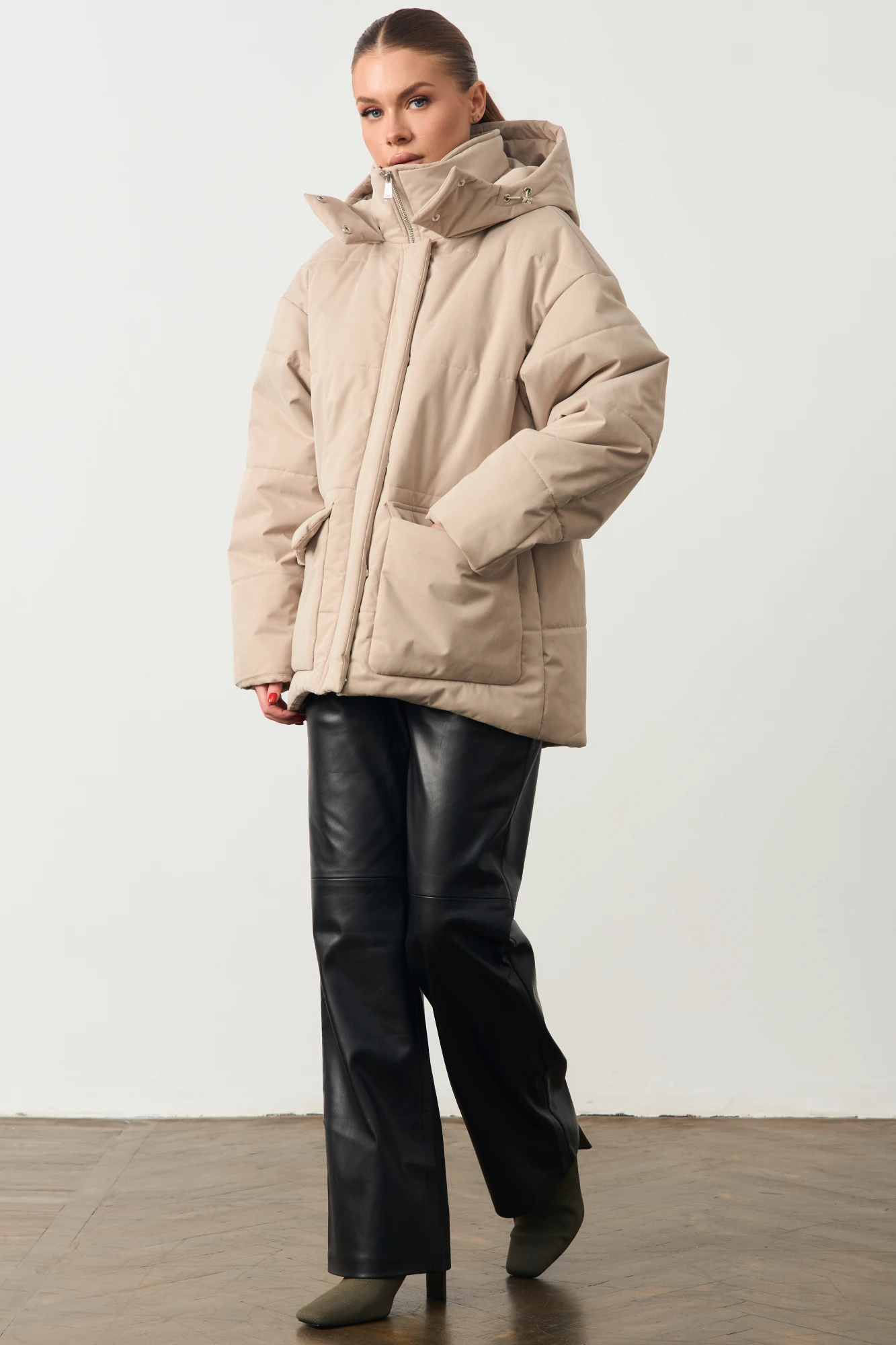 Женская осенняя куртка с капюшоном. Модель выполнена из водоотталкивающего материала. Изделие с утеплителем. Застежка тесьма-молния с планкой на кнопках. Капюшон съёмный. По переду изделия накладные карманы.