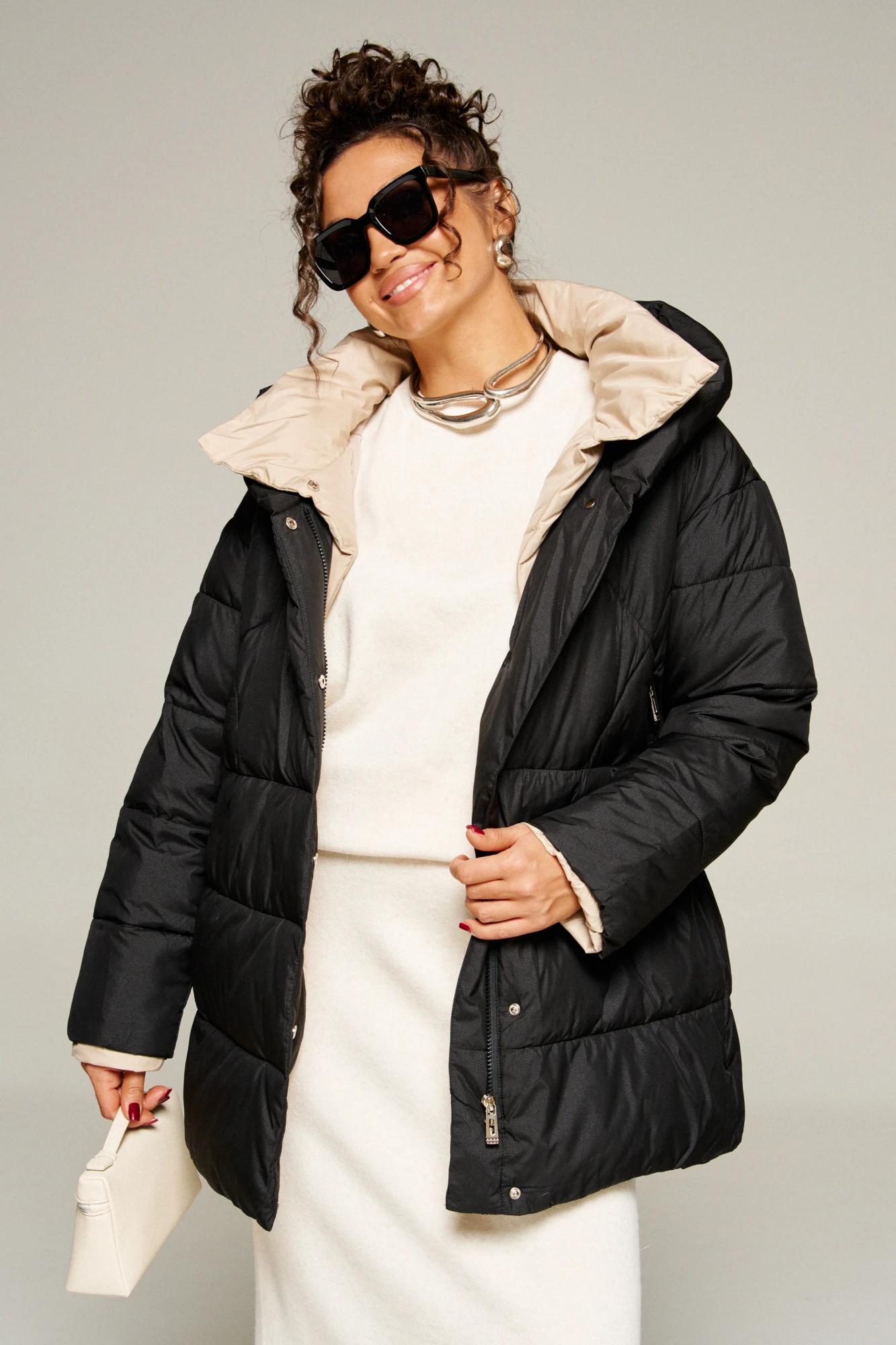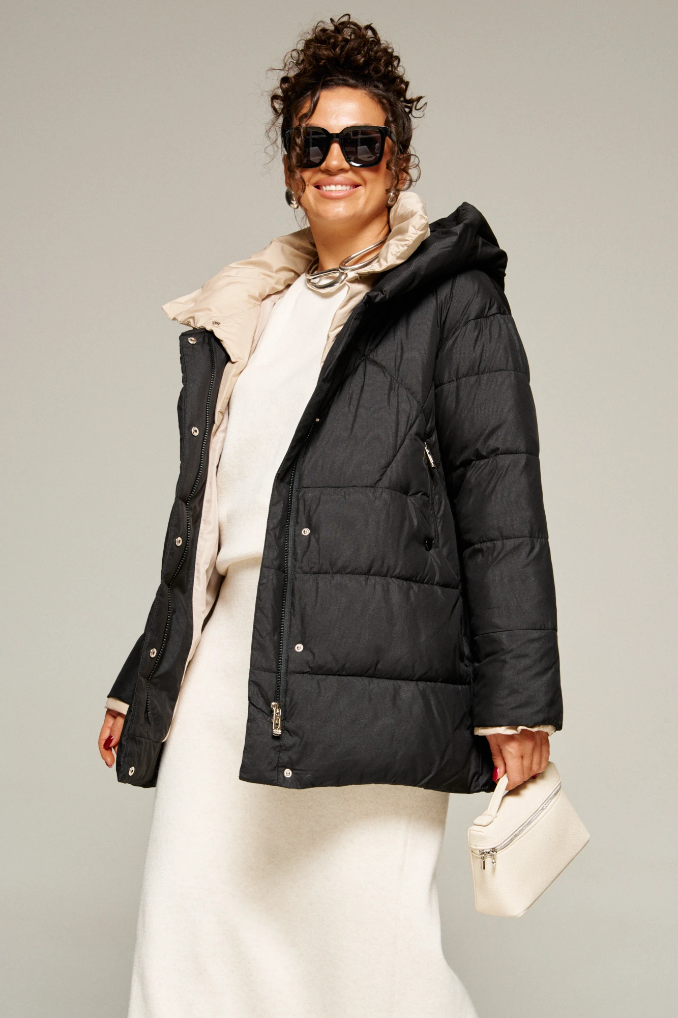 Современный объёмный крой и спущенная линия плеч создают расслабленный актуальный силуэт. А широкий воротник играет роль дизайнерского акцента.
