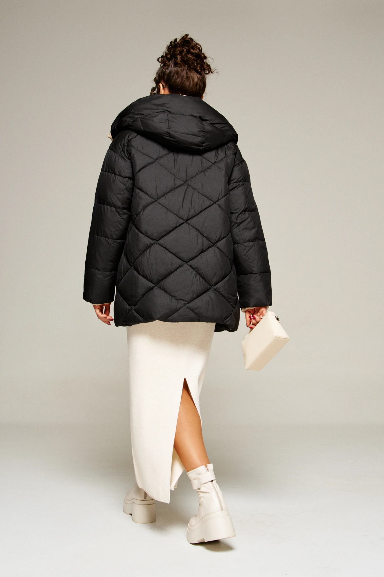 Застежка центральная на двустороннюю молнию от уровня груди до низа и кнопки по краю борта.
