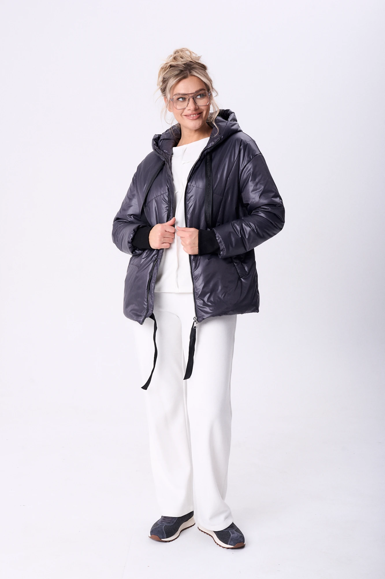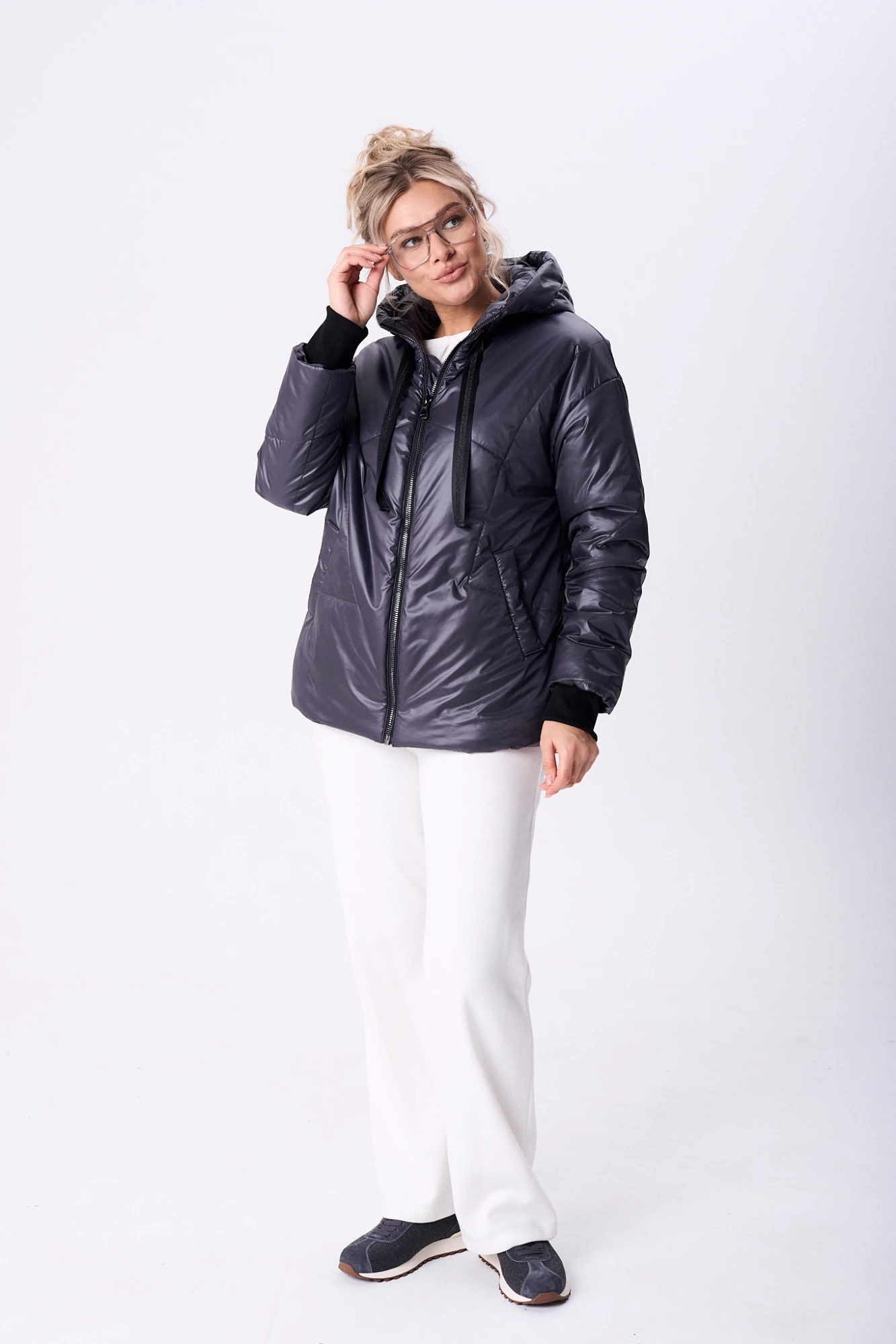 Куртка женская свободного облегания с застежкой на молнию. Спинка с фигурной стежкой. Перед с фигурной стежкой и боковыми прорезными карманами с листочкой. Воротник-капюшон с центральной и боковыми частями с кулисой, шнуром и блочками.Рукав одношовный со спущенной линией плеча с фигурной стежкой и притачными изнутри манжетами-довязами. Куртка на подкладке, с декором печатью на спинке и кулисой со шнуром по низу. Куртка утепленная. По спинке декор+нашивка.