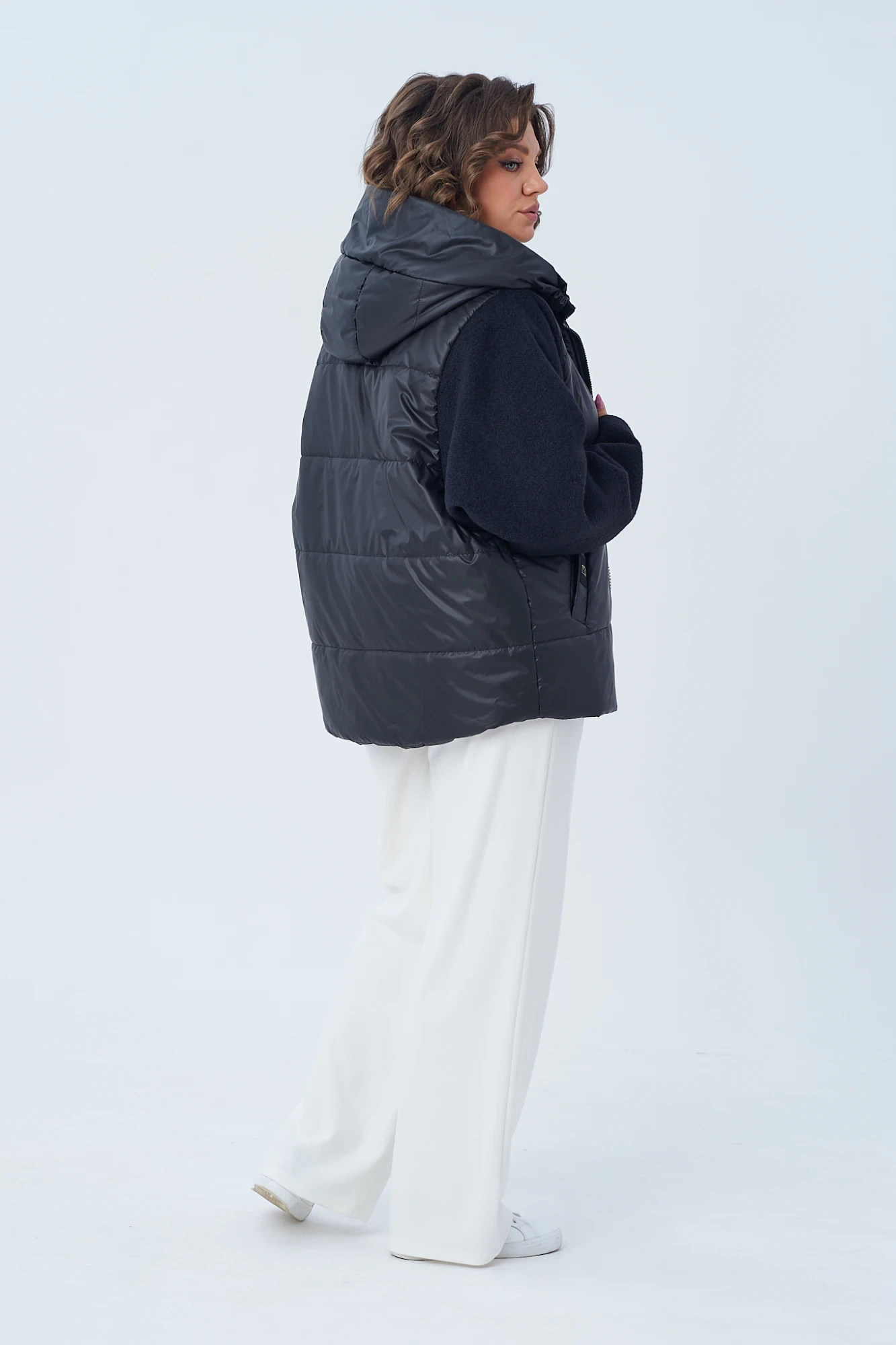 Стильная женская куртка, полуприлегающего силуэта с центральной застежкой на тесьму-молнию. По переду прорезные карманы с листочкой. Спущенная линия проймы. Рукав втачной одношовный из отделочной ткани, длинный с отворотом по низу. Капюшон с отделочной деталью по отлету, объемный. Куртка на подкладке. Используется основной материал -плащевка (плотность 70 гр/м2). В качестве отделки -теплая ткань с мягким ворсом. Утеплитель Hoopon (плостность 150 г/м2). Подходит под температурный режим до -5 градусов. Для отделки используется фурнитура и отделочная строчка