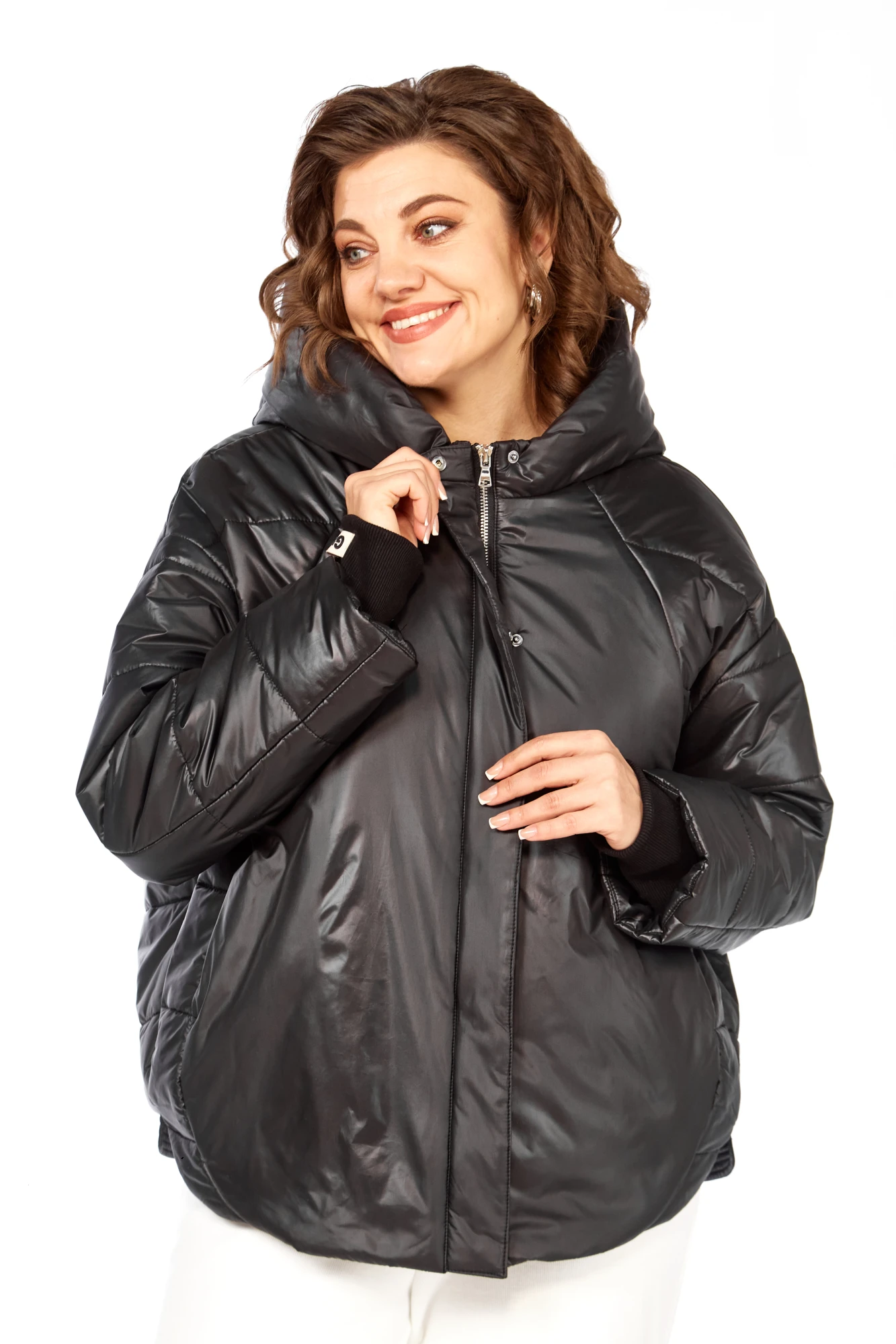 Куртка женская с центральной застежкой на тесьму-молнию и кнопки, спущенная линия плеча. По спинке рельефные швы от горловины до низа, по низу притачная отделочная планка. По переду рельефные швы от горловины до низа, в рельефных швах обработаны карманы. рукав втачной одношовный с манжетом по низу. Капюшон с центральной частью и отделочной деталью по отлету. Утеплитель синтепон 150 гр