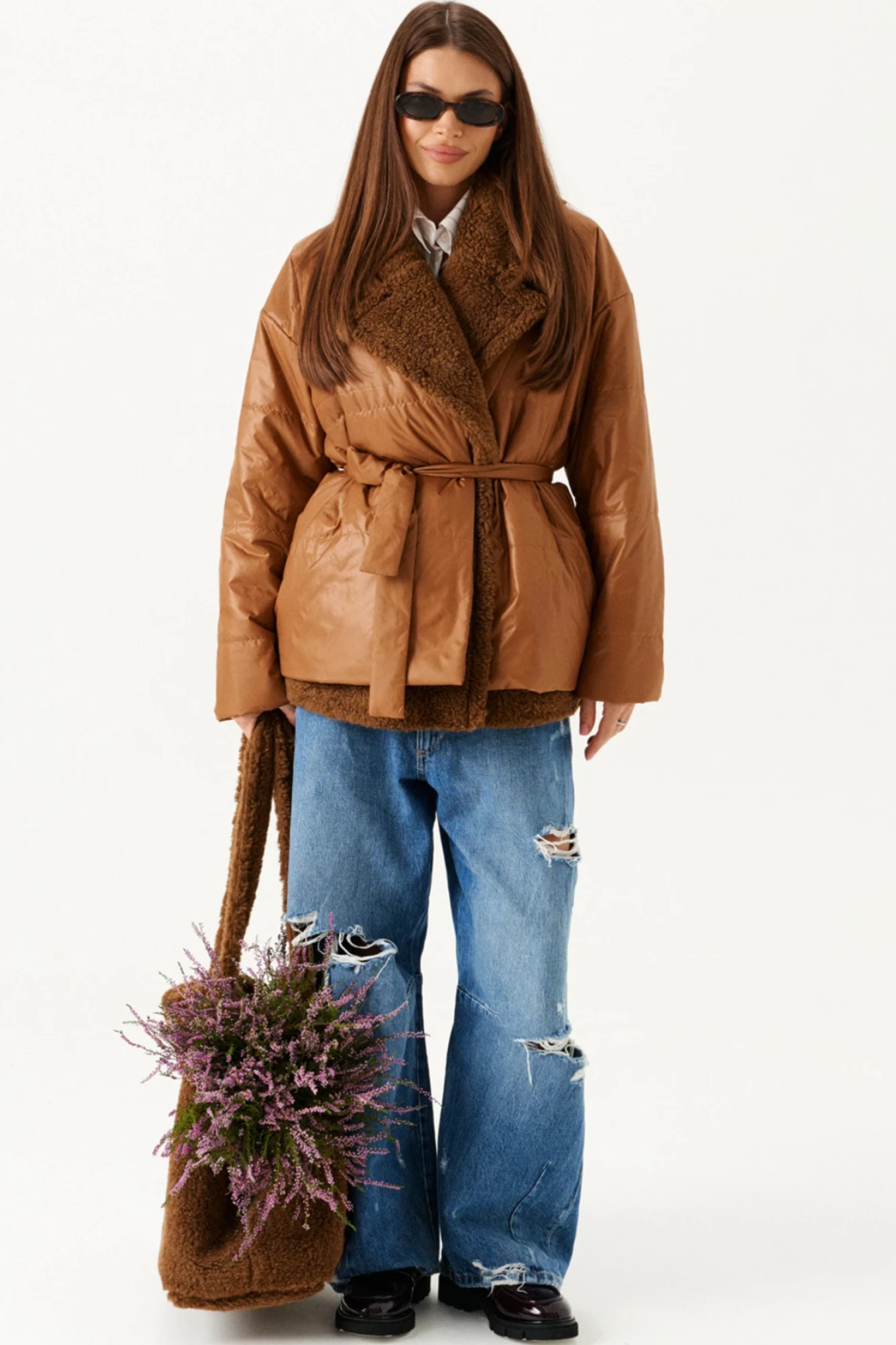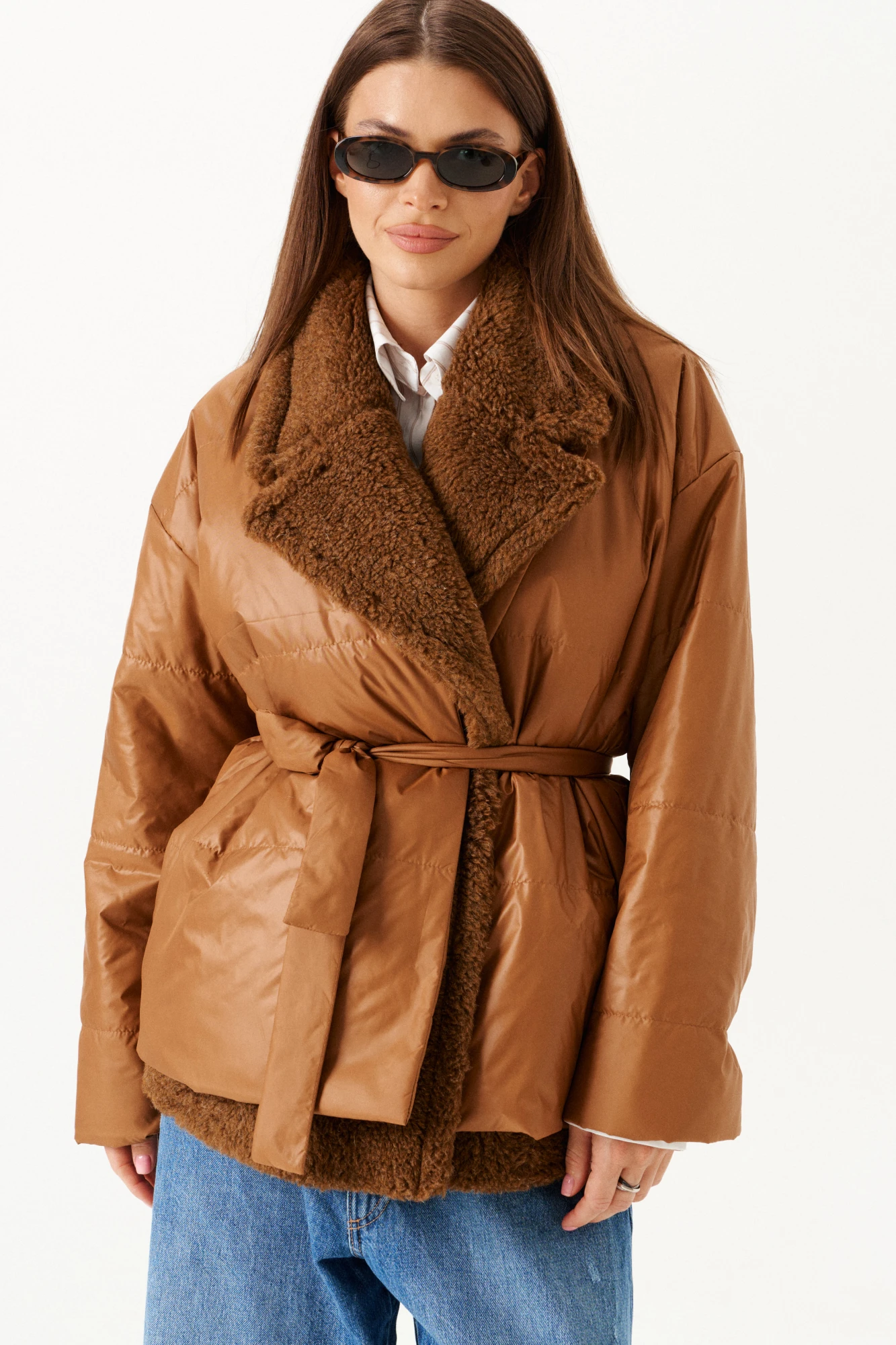 Куртка двойная из различных материалов. Верхняя куртка из плащевой ткани с утеплителем изософт 150г/м2, прямого силуэта, свободная, длиной до линии бедер,без застежки -под пояс (пояс из основной ткани в комплекте), с отложным воротником и лацканами, в боковых швах расположены карманы, рукав втачной, длинный. Внутренняя подстежка без рукава из искусственного меха на трикотажной основе, прямого силуэта, с центральной застежкой на потайную кнопку, с отложным воротником и лацканами, на подкладке.
