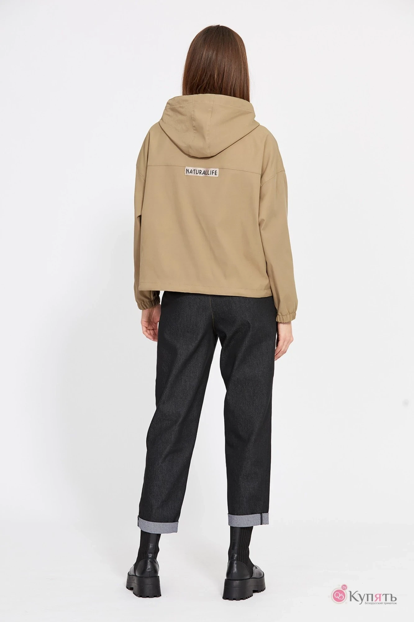 Куртка-ветровка выполнена из однотонной плащевой ткани. Куртка прямого силуэта, длиной выше линии бедер. Застежка спереди на пробивные кнопки. Спереди накладные карманы с клапанами, застегивающимися на пробивные кнопки. Так жеесть карманы в боковых швах. На спинке обработана кокетка. Горловина округлой формы, обработана капюшоном. Плечевой шов спущен. Рукав одношовный, на манжете с эластичной тесьмой. Низ куртки обработан подгибкой с закрытым срезом со шнуром из основной ткани. Куртка без подкладки. Куртка декорирована настрочной тесьмой по спинке.