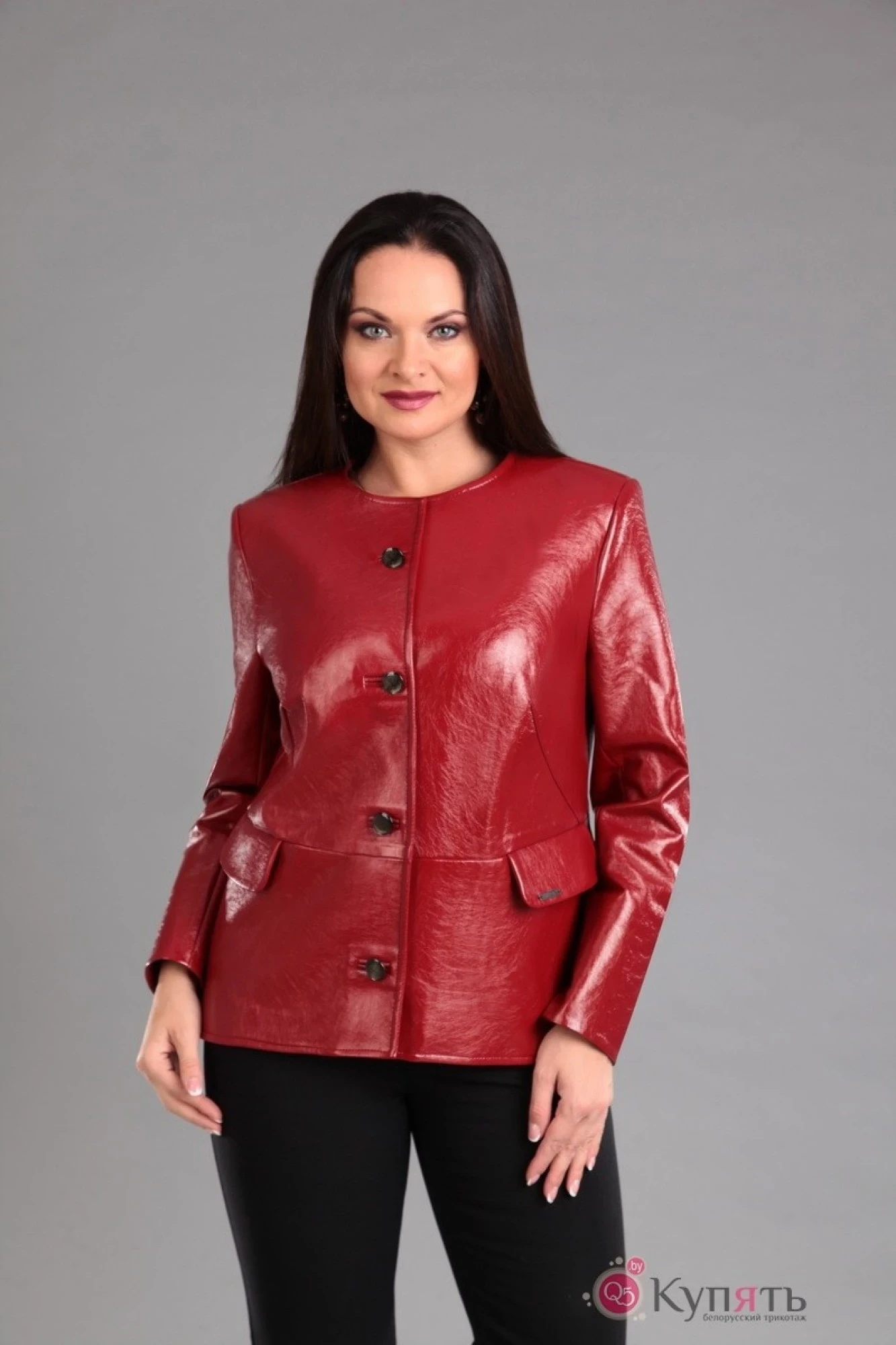 демисезонная куртка из ЭКО-кожи-лака на подкладке полуприлегающего силуэта, застежка на петли и пуговицы, втачные рукава, отрезная по талии с карманами по переду.