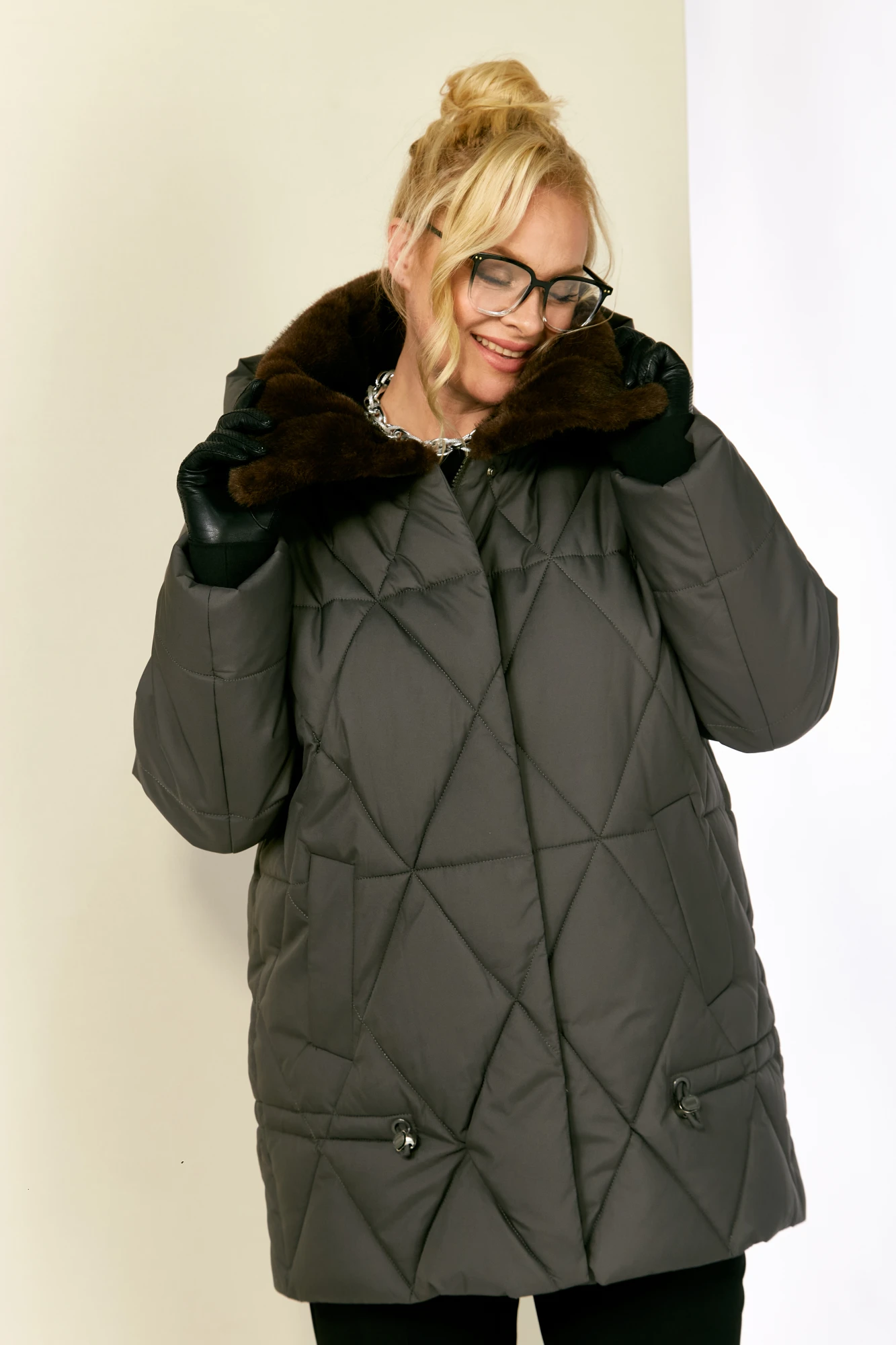 Зимняя, модная женская куртка, которая идеально подойдет для холодных дней, обеспечивая комфорт и защиту от ветра. Изделие прямого, классического стиля, выполнена из курточной матовой ткани высокого качества, непромокаемая. Утеплитель «Холлофайбер» хорошо держит форму и не сбивается. По переду центральная застежка на молнии и металлические кнопки. Карманы прорезного типа на магнитах. Нижняя часть изделия регулируется декоративным шнуром. Рукав втачной. Для защиты от ветра и мороза, рукава по низу дополнены внутренними трикотажными манжетами. Воротник отделан мехом, максимально по внешнему виду приближенный к натуральному «Норка». Капюшон съемный, регулируется декоративным шнуром. Спинка цельная.