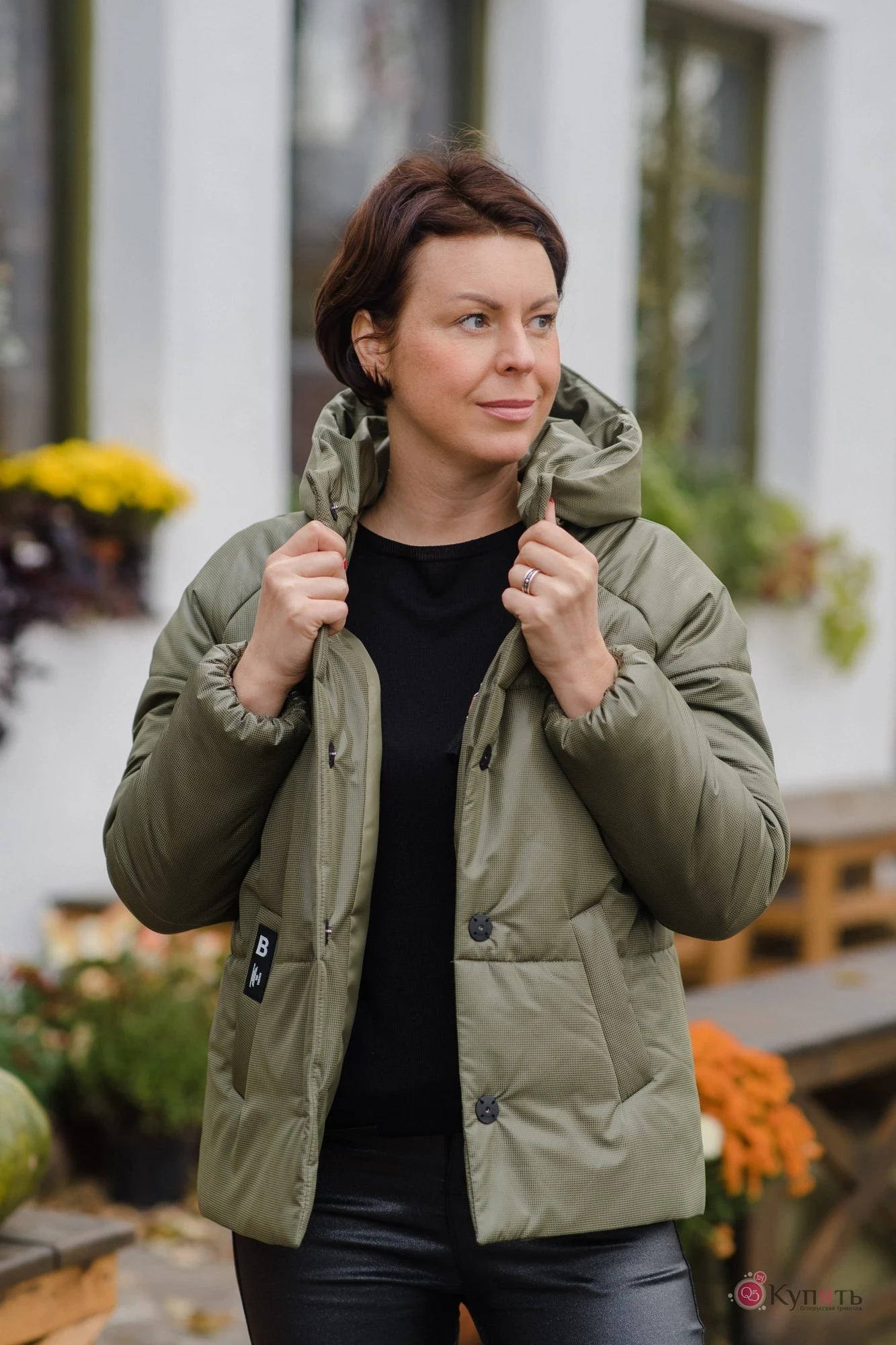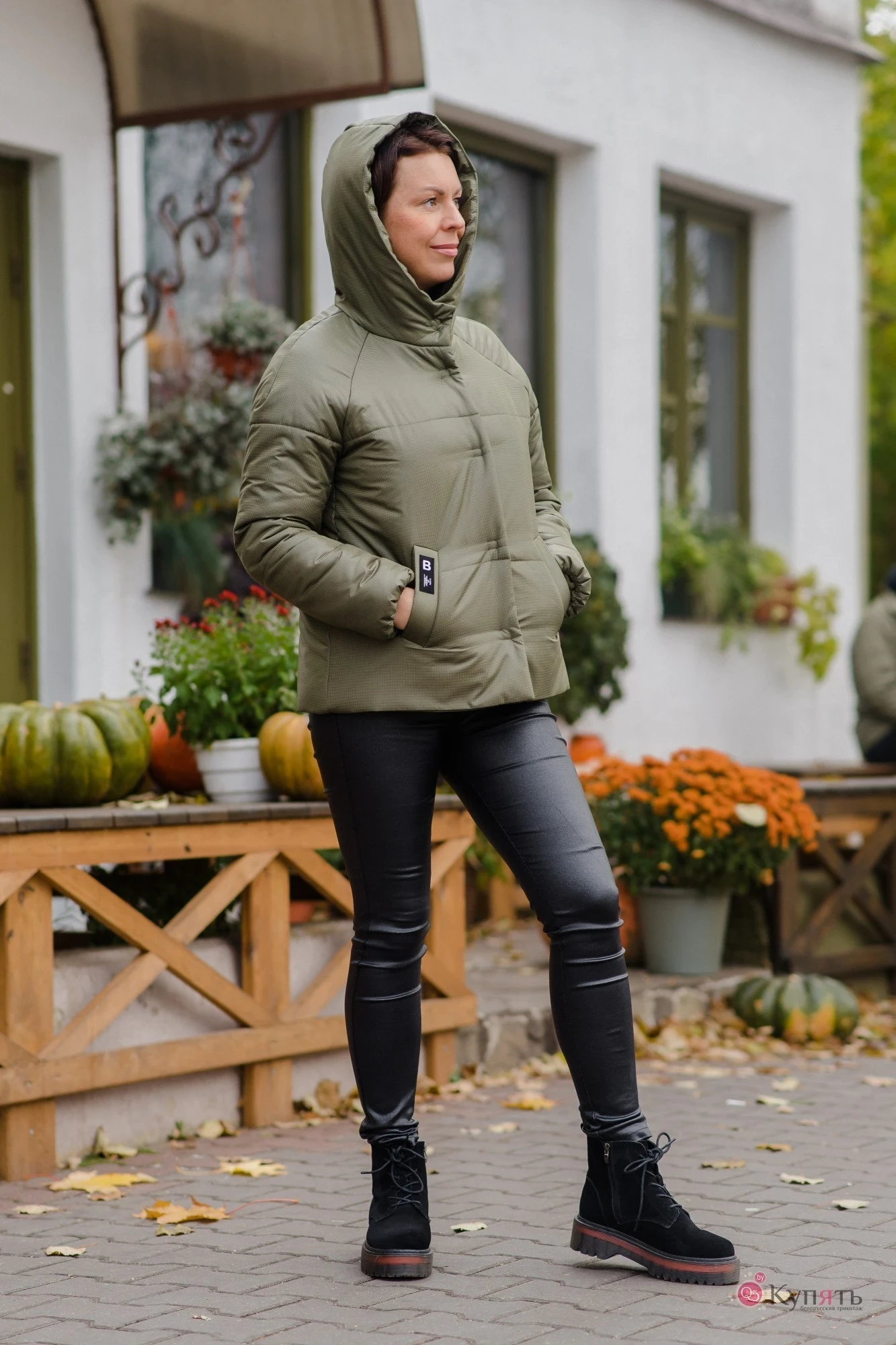 Комфортная женская куртка прямого силуэта с рукавом реглан, по низу рукав чуть прсборен. Спереди наклонные карманы "листочки". Один рукав задекорирован отделочной нашивкой. Застежка однобортная на потайные. Горловина оформлена капюшоном, спереди переходящим в стойку. Спинка без особенностей. Куртка на подкладке и на утеплителе HOOPON, выд. температурный режим -15 C. Длина куртки-46-50 размер-68 см, 52-56 размер-73 см. Длина рукава- от плеча -80 см.