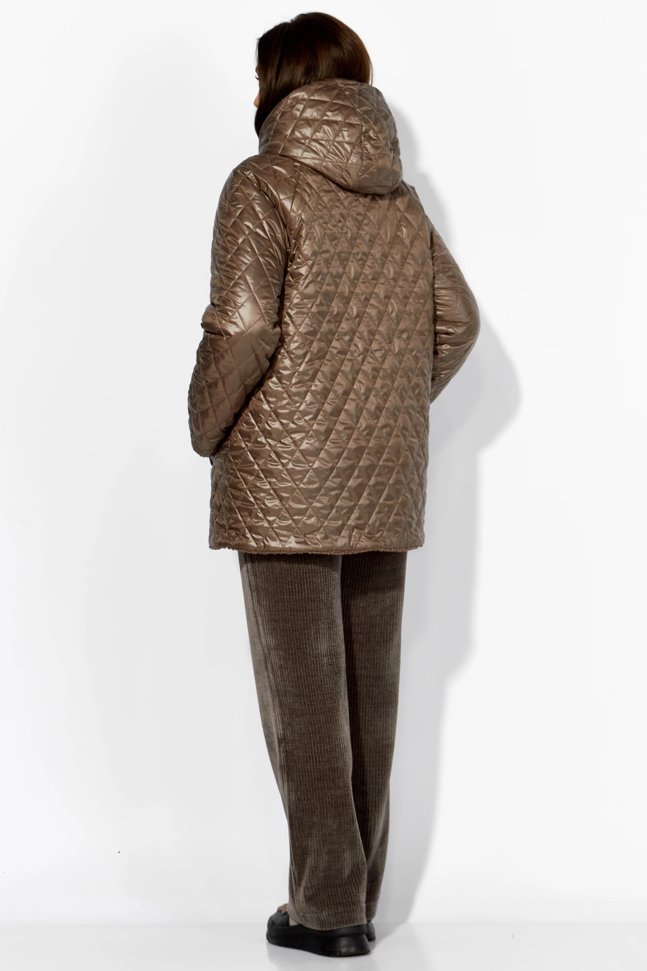 Куртка женская, демисезонная. Верх куртки - плащевка, стеганная на синтепоне. Подкладка - экомех "барашек". Куртка прямого силуэта с длинным рукавом "реглан". Длина рукава может регулироваться отворотом. По переду центральная застежка на "молнию" и прорезные, функциональные карманы. Горловина оформлена капюшоном-стойкой по переду.