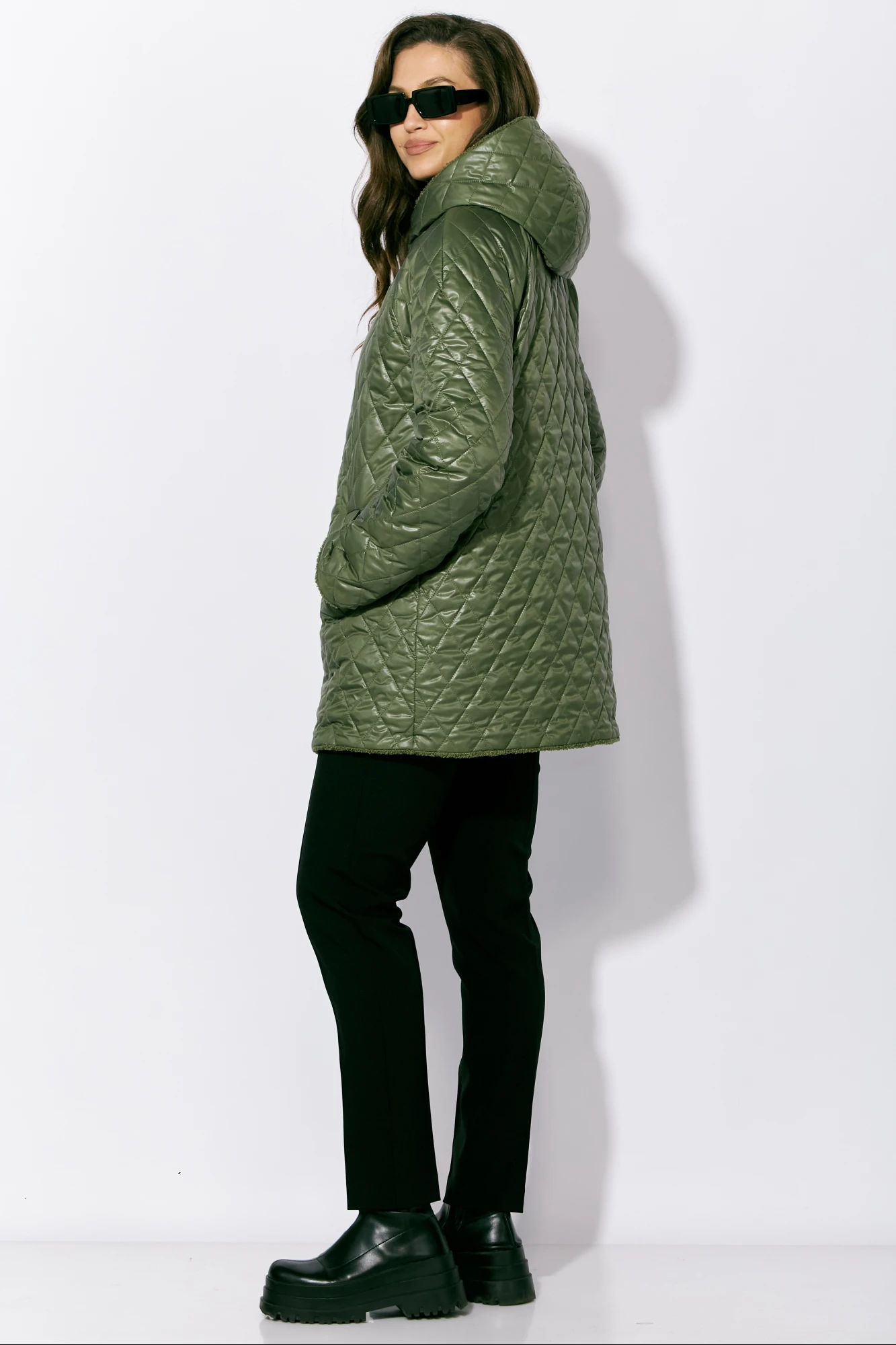Куртка женская, демисезонная. Верх куртки - плащевка, стеганная на синтепоне. Подкладка - экомех "барашек". Куртка прямого силуэта с длинным рукавом "реглан". Длина рукава может регулироваться отворотом. По переду центральная застежка на "молнию" и прорезные, функциональные карманы. Горловина оформлена капюшоном-стойкой по переду.