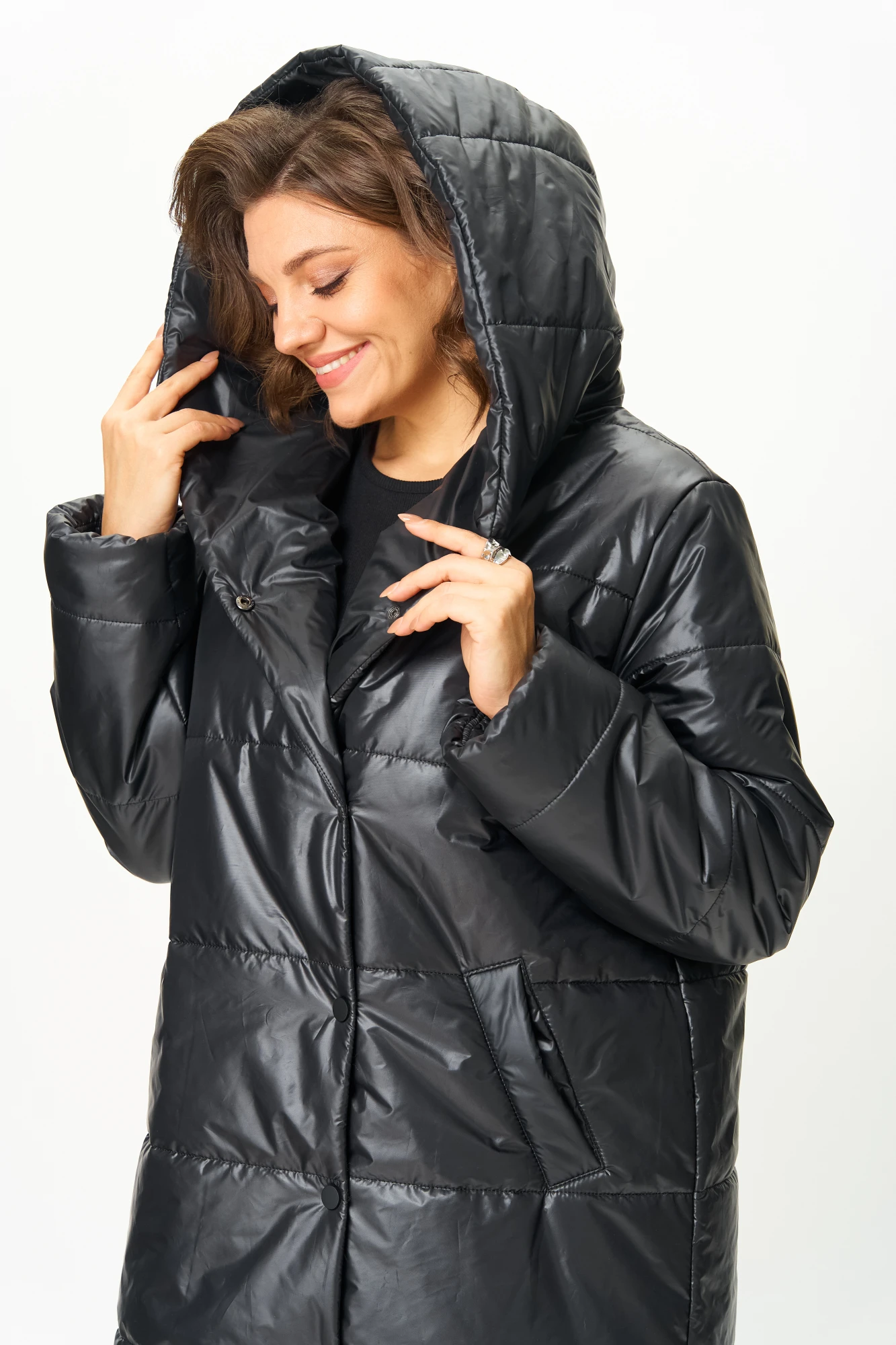 Полочка с центральной застежкой на кнопки. На полочке выполнены карманы с листочкой. Спинка цельная. Пальто с капюшоном. Рукав одношовный, втачной, по низу рукава, с внутренней стороны настрочена резинка. Пальто на подкладке.