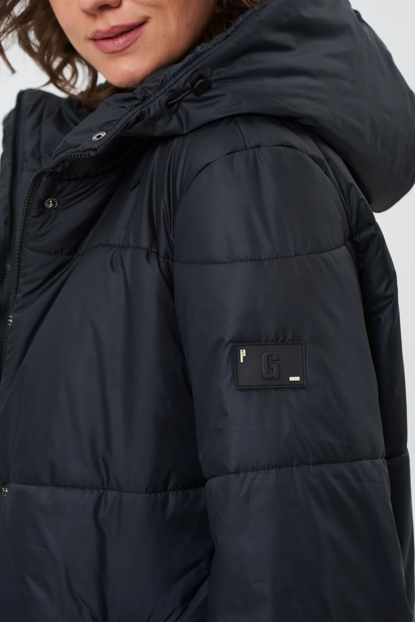 Теплое, при этом лёгкое пальто станет любимой вещью Вашего зимнего гардероба. Пальто прямого силуэта с одношовными втачными рукавами, с капюшоном, с застёжкой спереди на молнию и кнопки по планке. По переду выполнены карманы, на рукаве декоративная нашивка.