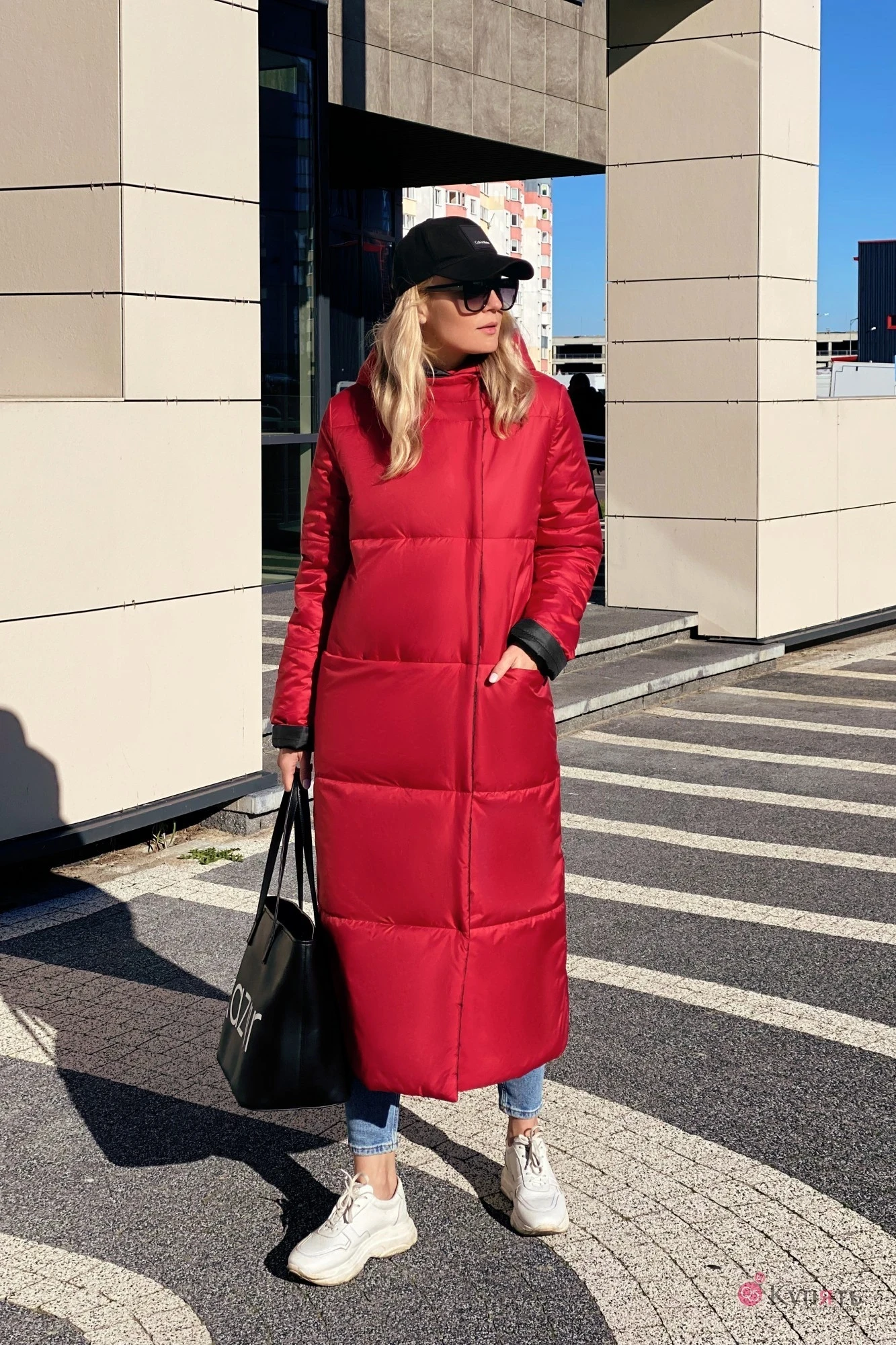 Пальто красно-черное. Пошив качественный, очень легкое, очень теплое (пока носила до -5). Заказывала размер 50 (соответствует). Магазину и производителю спасибо!