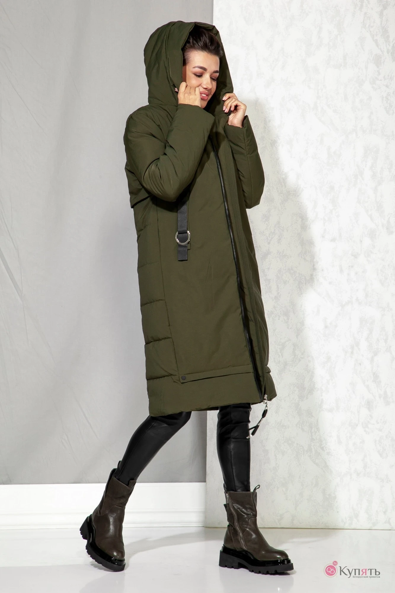 Застежкаимеет длину от линии низа до верхнего края воротника-стойки, переходящего в капюшон.