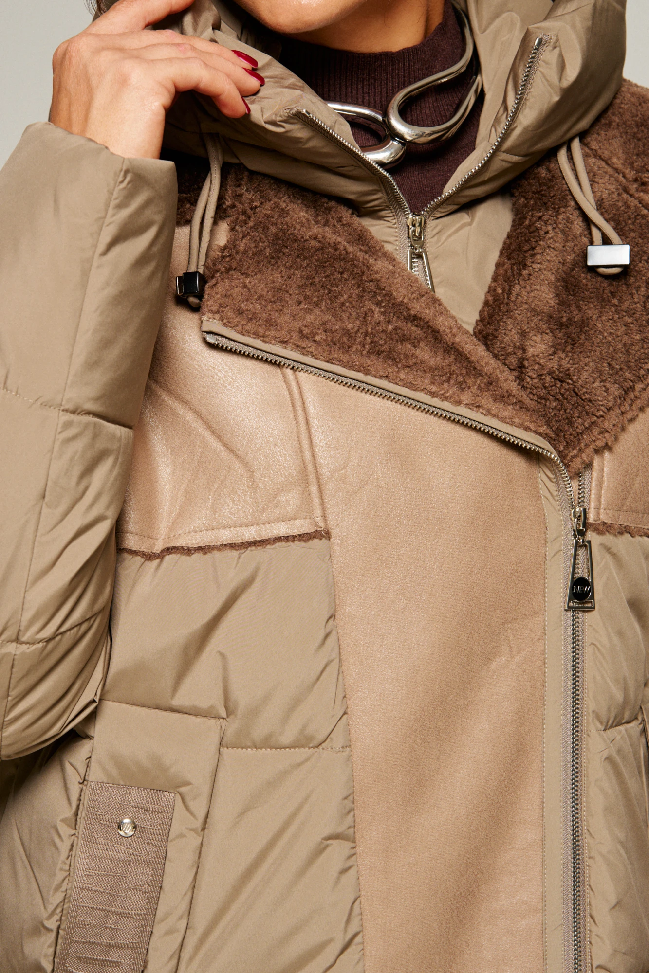Перед с подрезной кокеткой из экокожи и с симметричными боковыми прорезными карманами с широкой обтачкой, фиксируемые на кнопку. На правом кармане выполнен декоративный элемент в виде широкой репсовой тесьмы. Центральная вставка переда, переходящая в воротник, выполнена из двусторонней экокожи, где внутренняя сторона – искусственный мех «овчина».