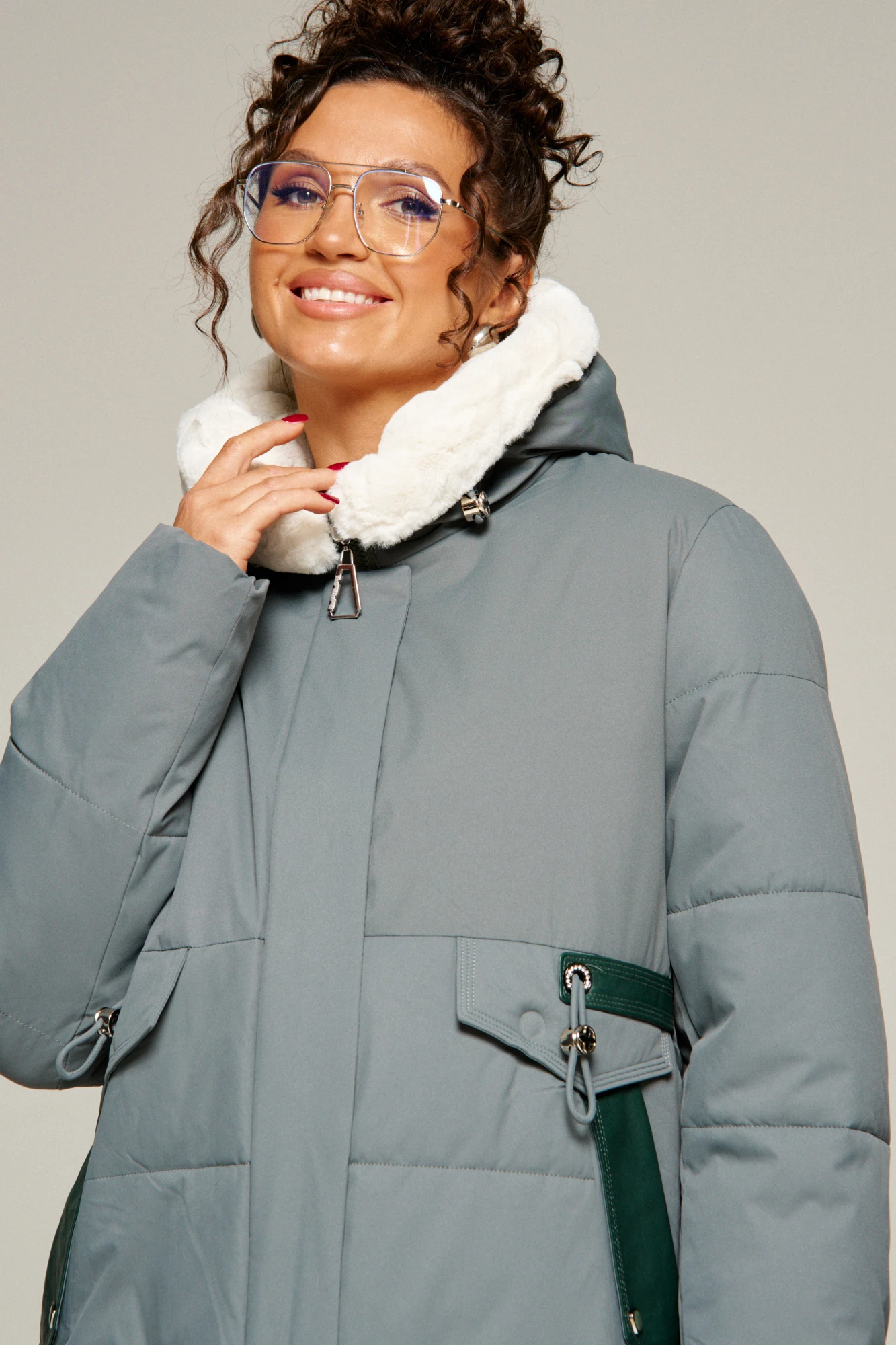 Капюшон с застежкой спереди умеренного объема. Внутренняя часть капюшона выполнена из искусственного меха, который выполняет декоративную и защитную функции, создавая дополнительное тепло и защиту от ветра и холода.