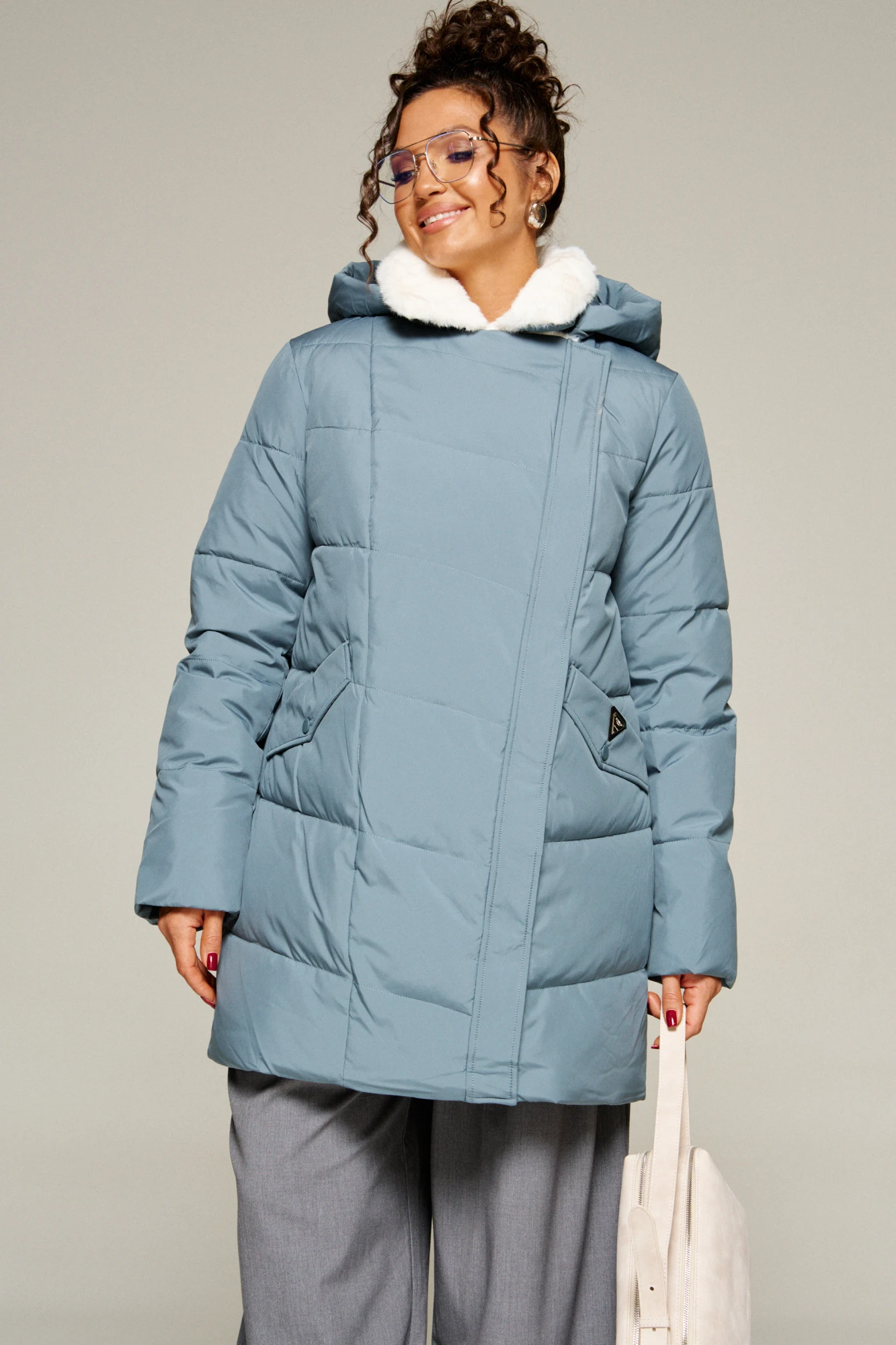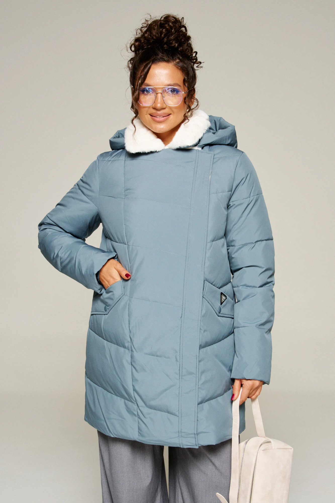 Воротник пиджачного типа с возможностью застегивания до верха. Внутренняя часть воротника и лацканы обработаны искусственным мехом.