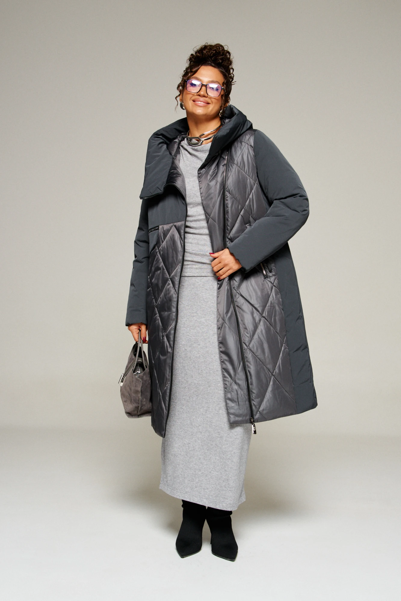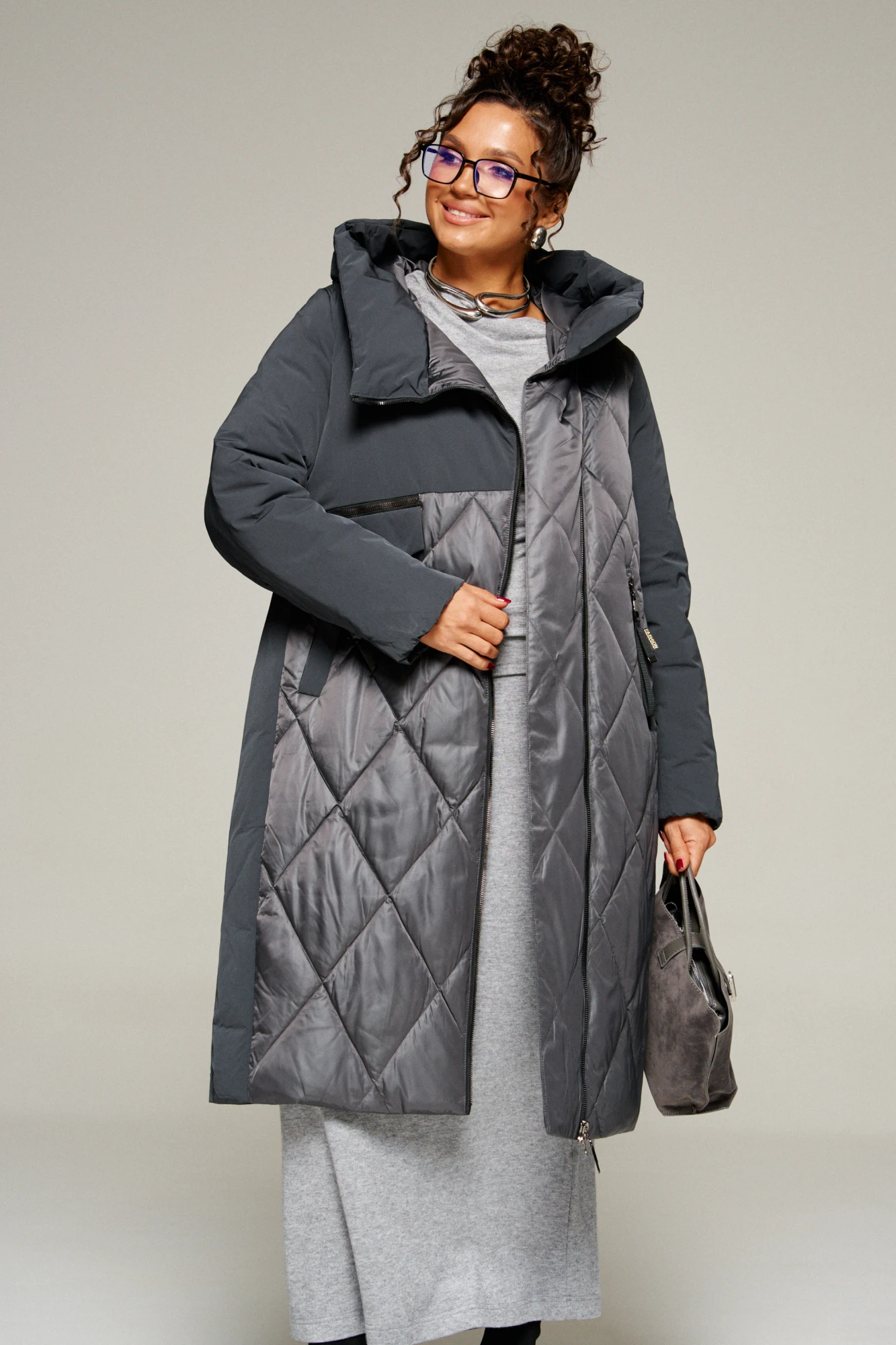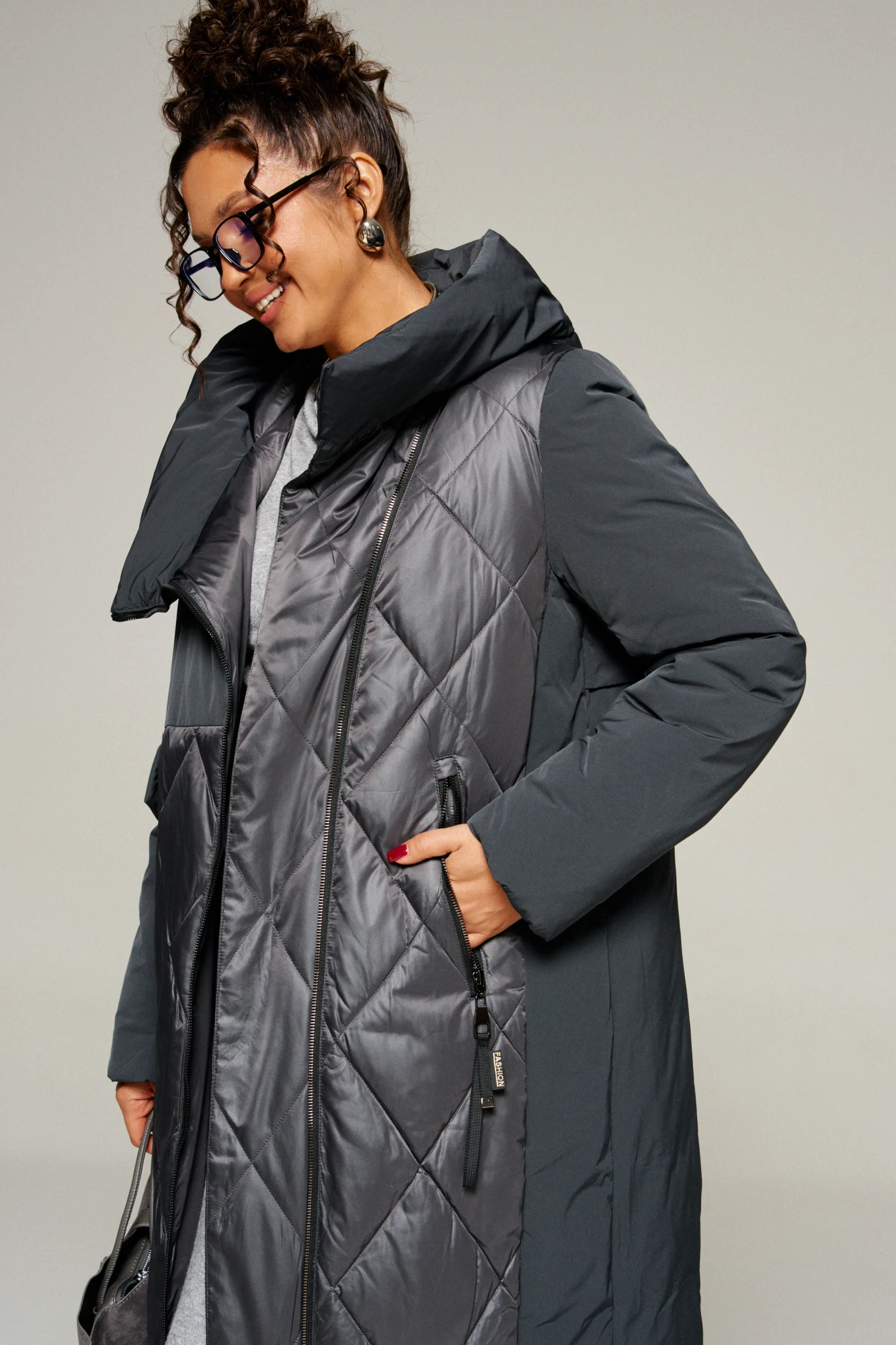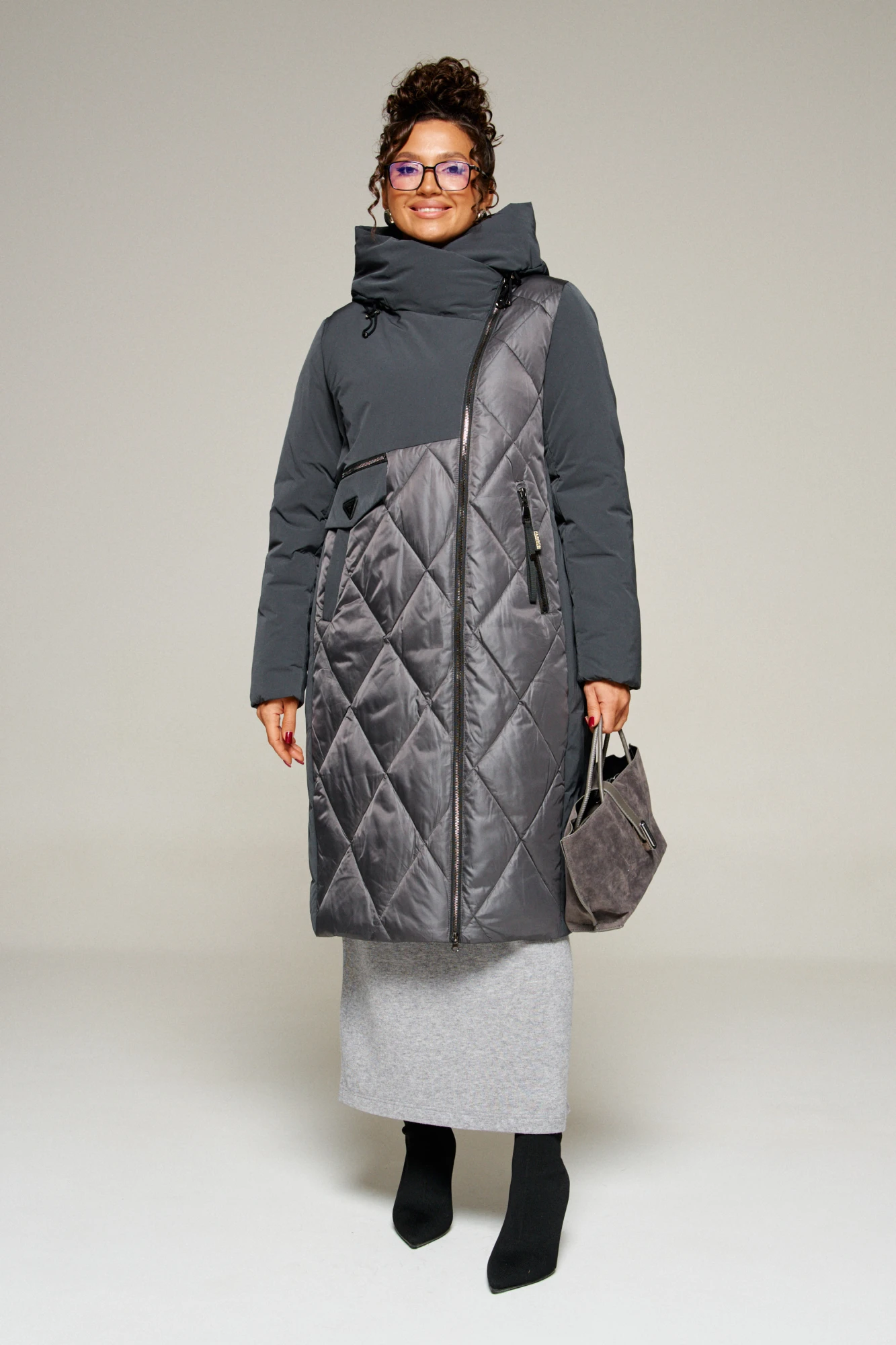 Перед асимметричный. С правой стороны расположены кокетка и вертикальный подрез от неё. В кокетку вставлена декоративная молния и клапан с пришивным отделочным элементом. На центральной правой части переда расположен боковой прорезной карман с обтачкой. С левой стороны – два вертикальных рельефа: от плеча (в который вставлена часть молнии) и от проймы, а также боковой прорезной карман на молнии с декоративным фиксатором. Центральные части переда выполнены из отделочной стеганой ткани с блеском аналогичного оттенка с цветом изделия.
