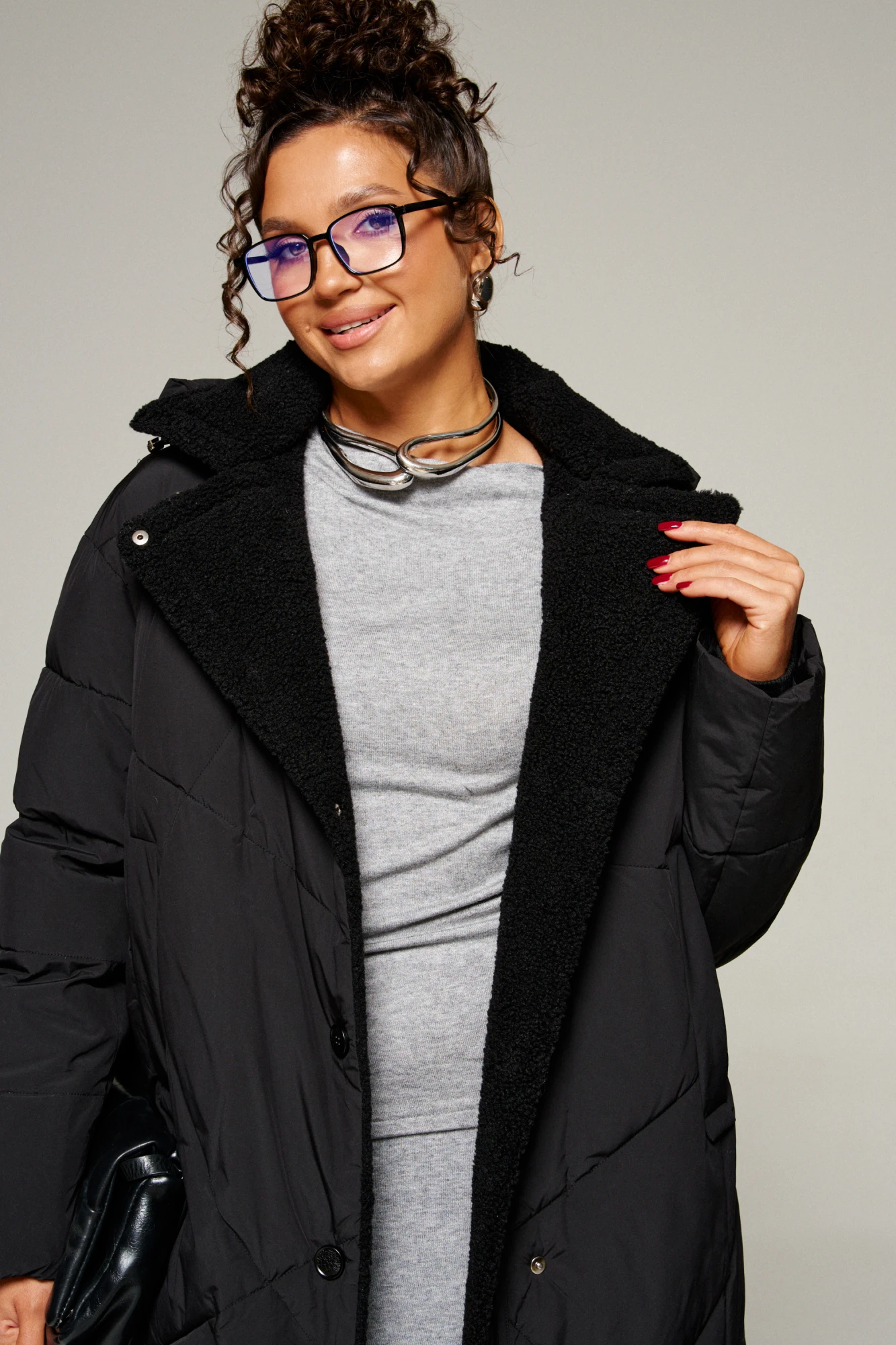 Воротник пиджачного типа с возможностью застегивания до верха. Внутренняя часть воротника, борта и лацканы обработаны искусственным мехом «овчина».