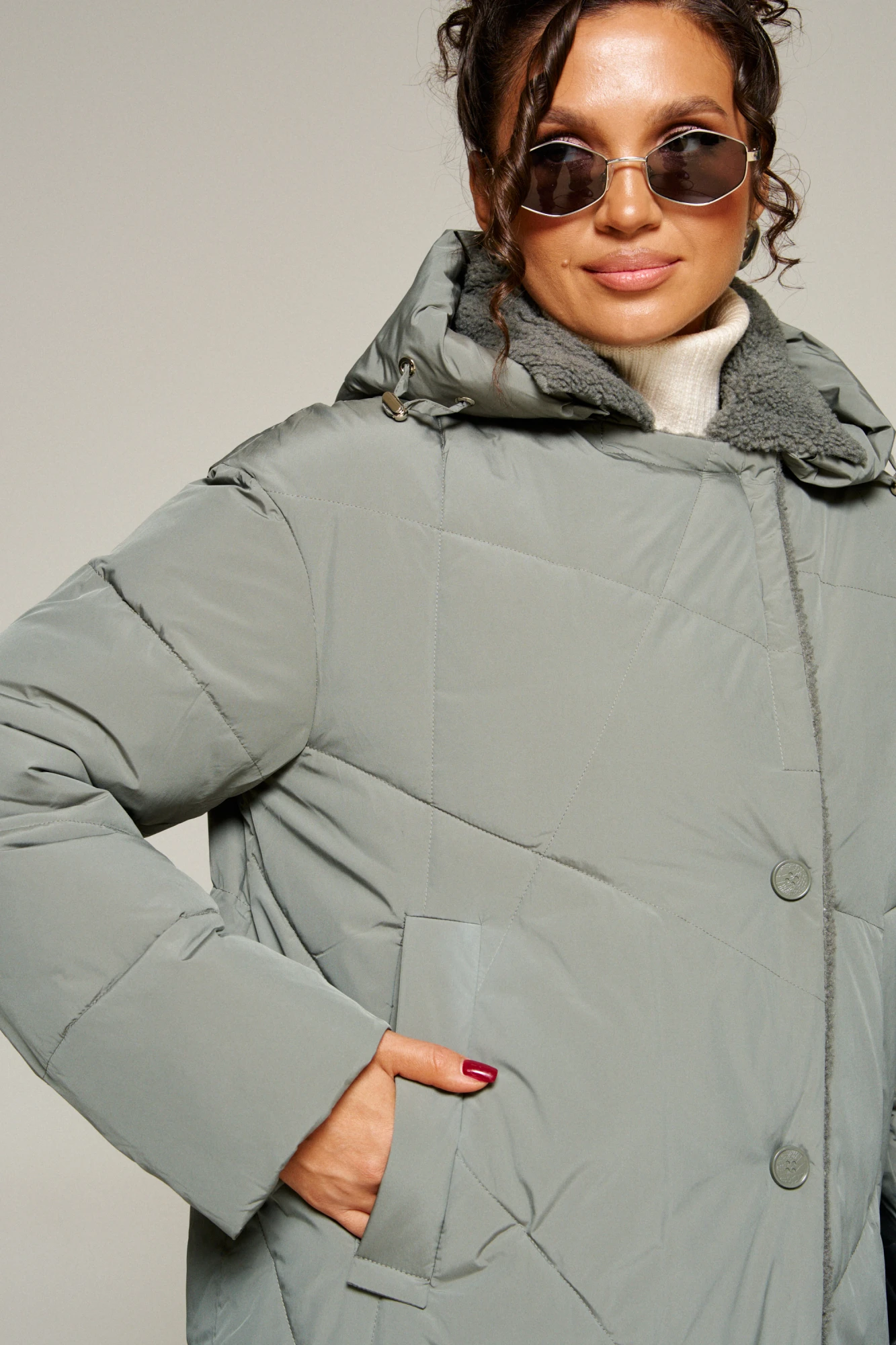 Капюшон съемный (на кнопках) умеренного объема. По периметру капюшона протянут шнур в цвет изделия с декоративными металлическими фиксаторами.