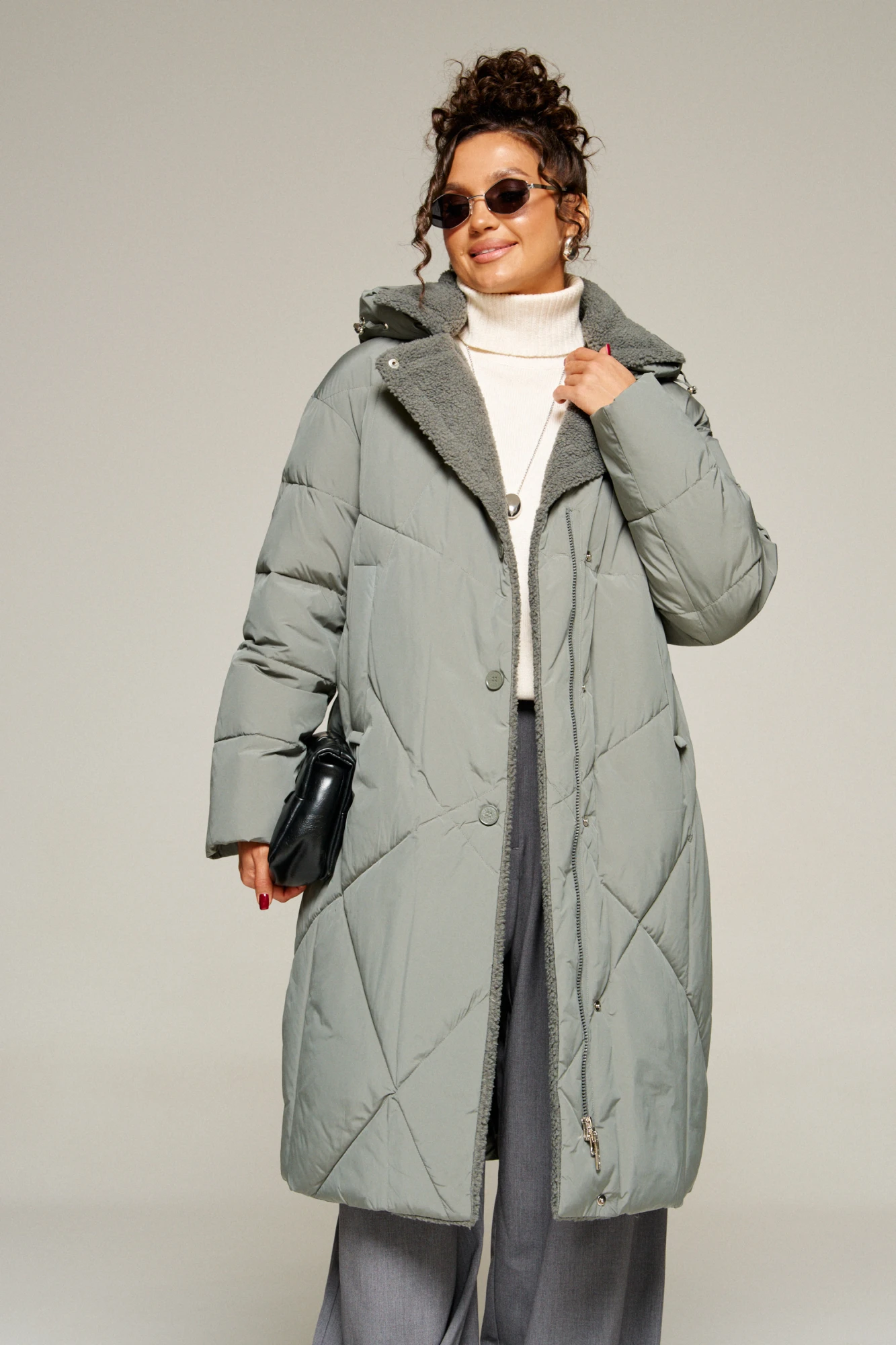 Воротник пиджачного типа с возможностью застегивания до верха. Внутренняя часть воротника, борта и лацканы обработаны искусственным мехом «овчина».