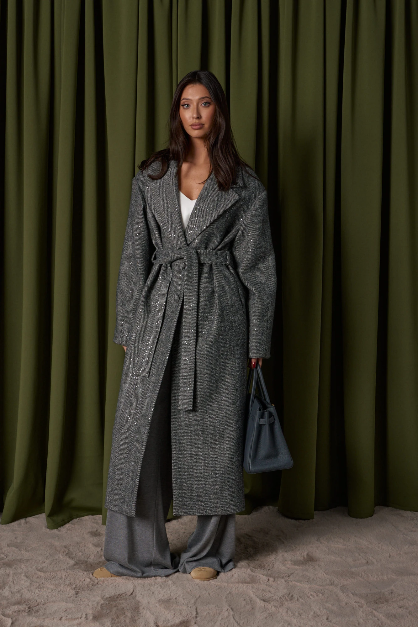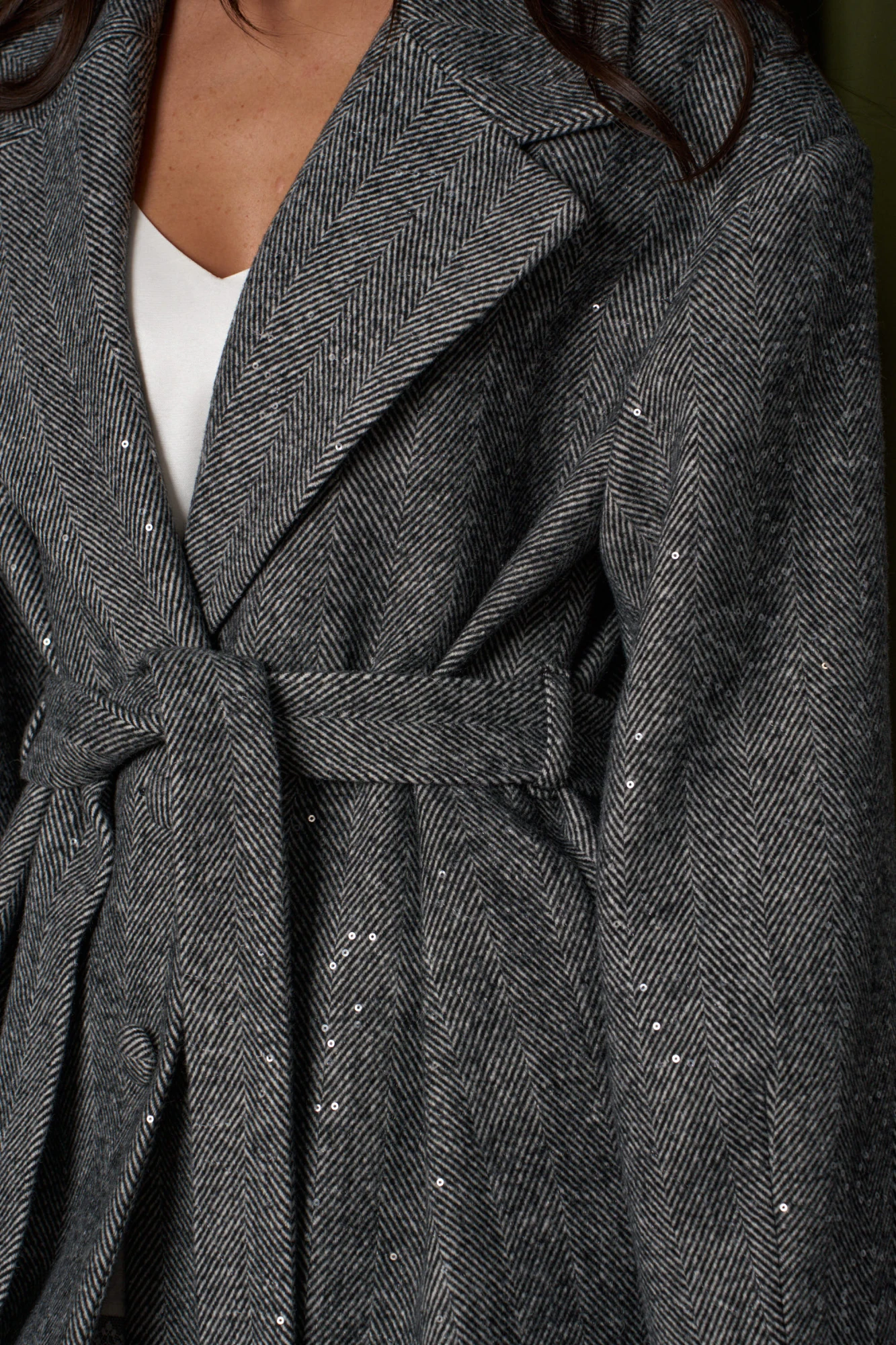 пальто прямого кроя, выполнено из шерстяной (смесовой) ткани серого цвета с пайетками. Характеристики: на брендированной подкладке, рукав втачной, к низу заужен, воротник пиджачного типа, в боковых швах карманы. Спинка со средним швом заканчивается шлицей, застёжка центральная на петли и пуговицы, пояс выполнен из основной ткани изделия.Длина по спинке от края горловины 127 см. Длина рукава от края горловины 77 см.