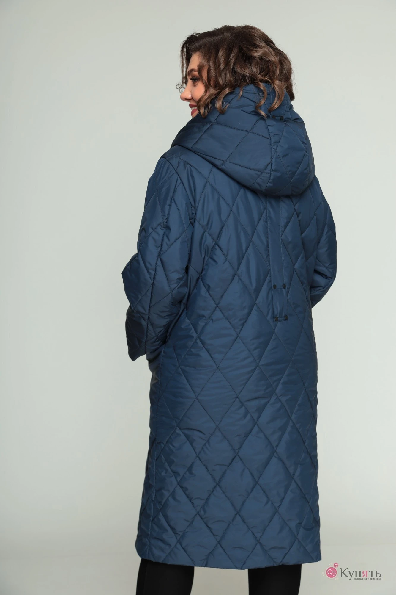 Пальто свободного силуэта, с центральной застежкой на кнопки, горловина оформлена капюшоном. По переду на уровне бедер накидные карманы с декором из хольнитенов.
