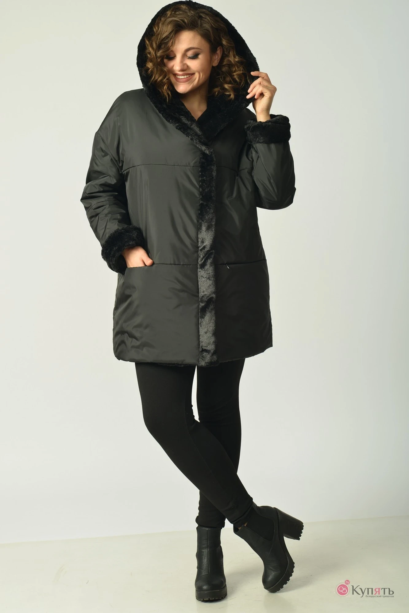 Полупальто женское , со смещённой застёжкой на потайные кнопки. По переду горизонтальные рельефные швы на линии груди и бёдер. В рельефе обработаны карманы с потайной молнией. По спинке горизонтальные рельефные швы по линии груди и бёдер. Рукав втачной одношовный, линия плеча спущена,горизонтальный рельефный шов на линии локтя. Подборт, капюшон и манжет рукава из отделочной ткани.