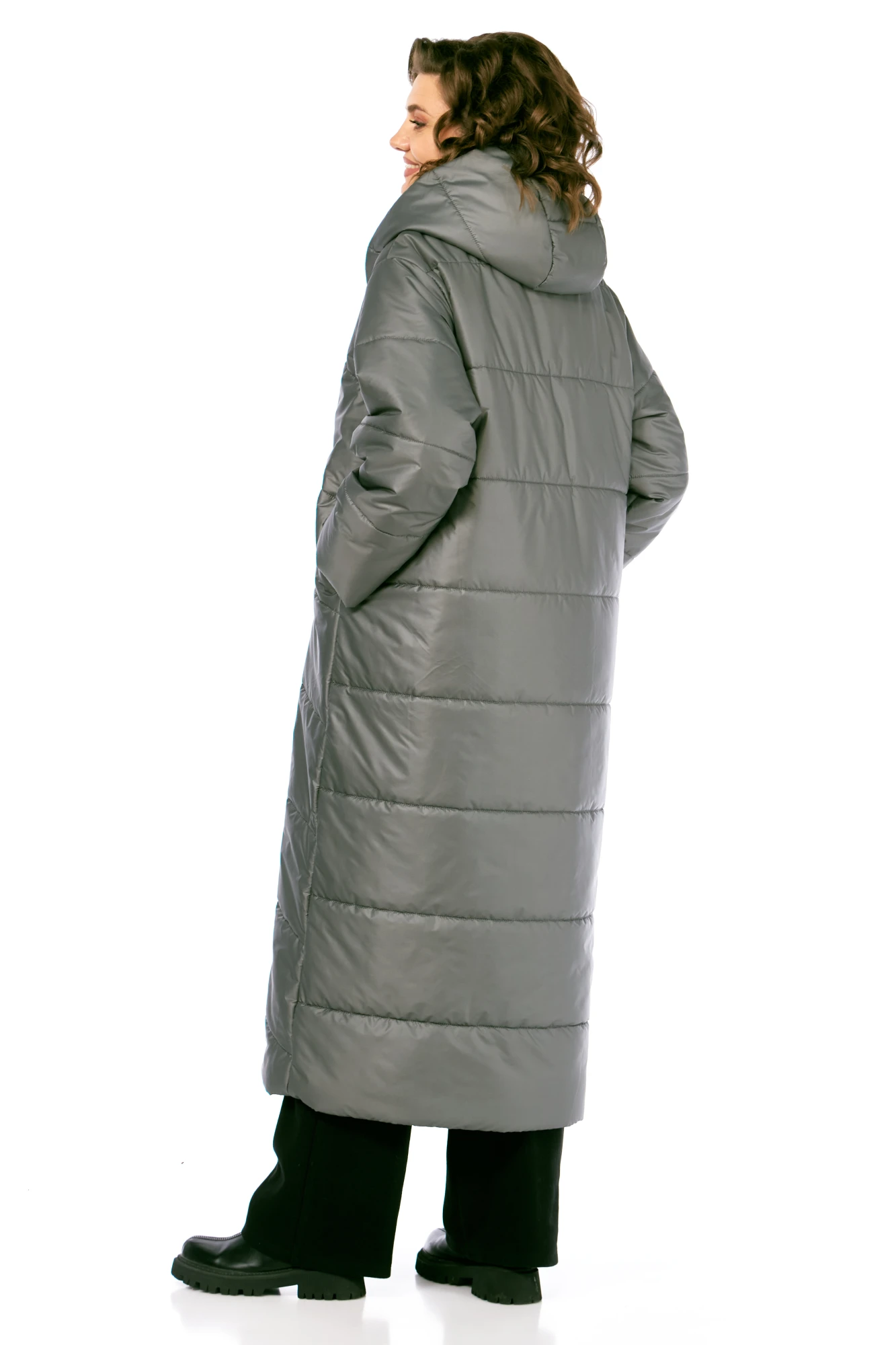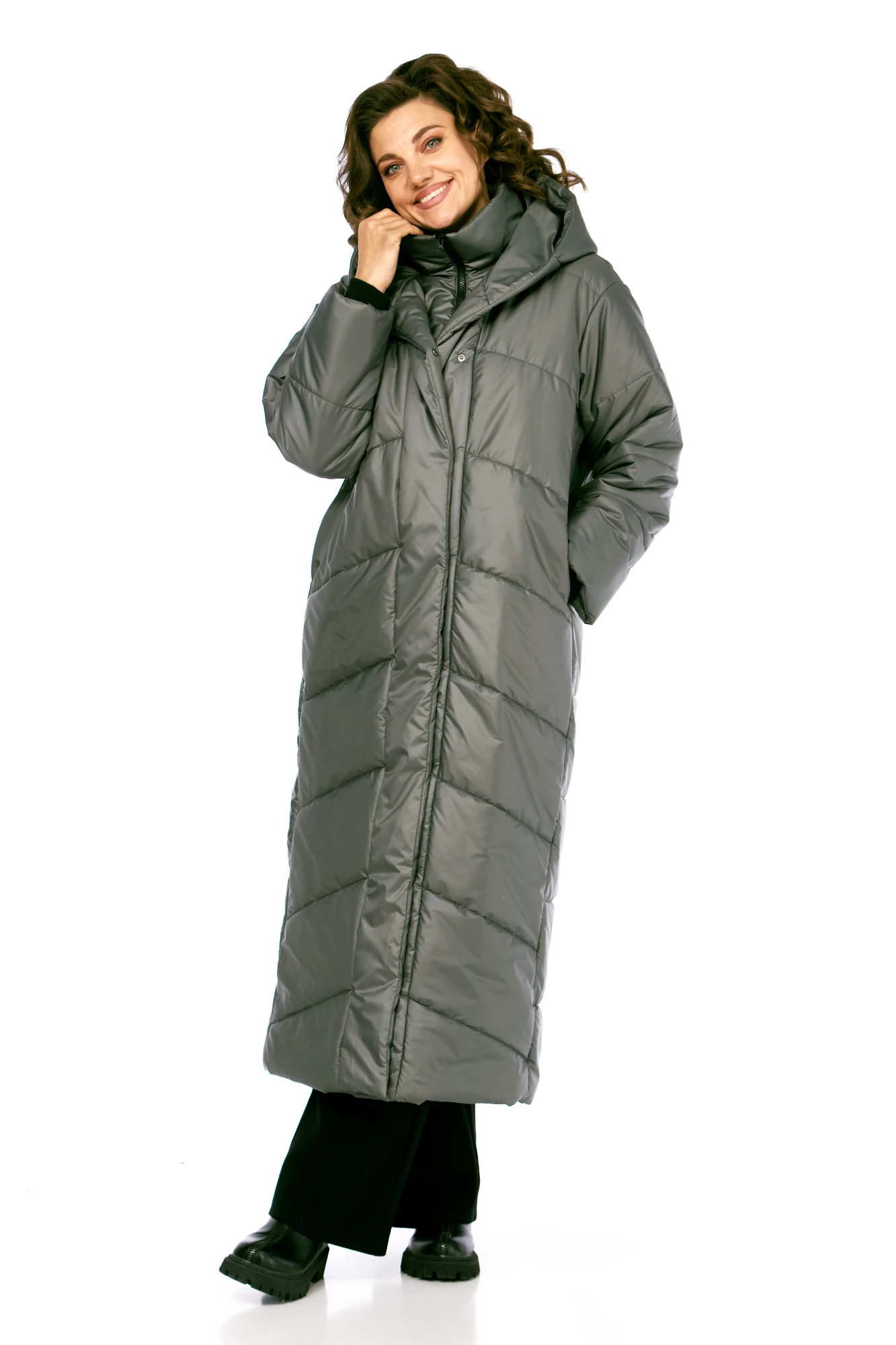 Пальто женское утепленное (длиной до щиколотки). Спинка с горизонтальной стежкой. Боковые швы смещены на перед. Полочки выстеганы по косой. Боковые карманы обработаны в швах. Рукав втачной, одношовный с трикотажными манжетами из-под подгибки. Паьлто с притачной манишкой, которая с воротником-стойкой и на "молнии". Капюшон соединен с планкой, которая застегивается на кнопки сверху до низа изделия. Температурный режим до -10 градусов.