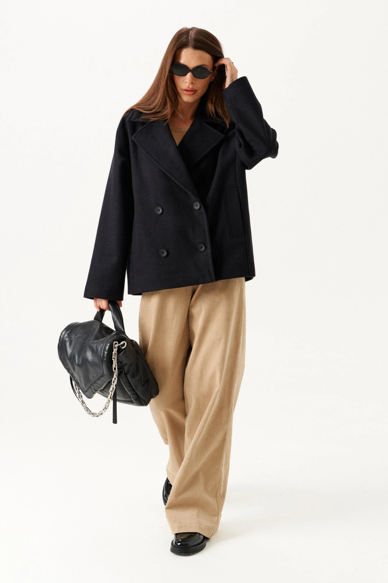Полупальто из пальтовой ткани, прямого силуэта, свободное, с центральной двубортной застежкой на петли и пуговицы, отложным воротником и лацканами пиджачного типа, на подкладке. Перед с отрезными бочками и прорезными карманами с листочкой. Спинка с отрезными бочками. Рукав втачной, длинный.