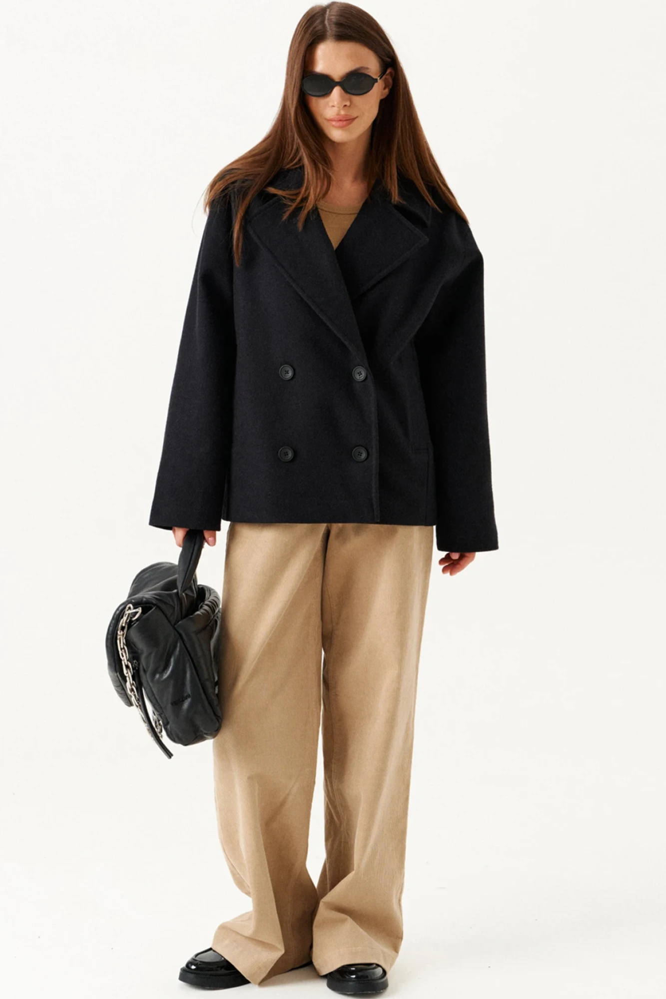 Полупальто из пальтовой ткани, прямого силуэта, свободное, с центральной двубортной застежкой на петли и пуговицы, отложным воротником и лацканами пиджачного типа, на подкладке. Перед с отрезными бочками и прорезными карманами с листочкой. Спинка с отрезными бочками. Рукав втачной, длинный.