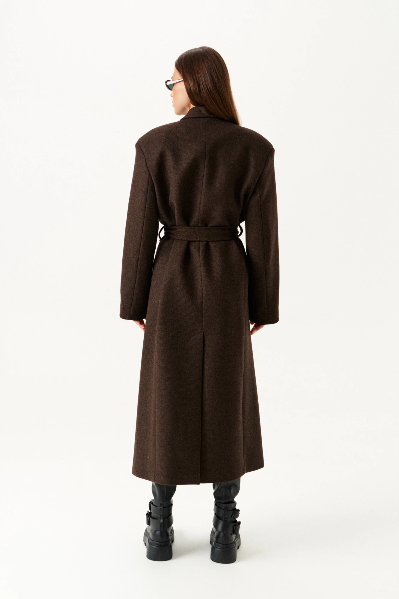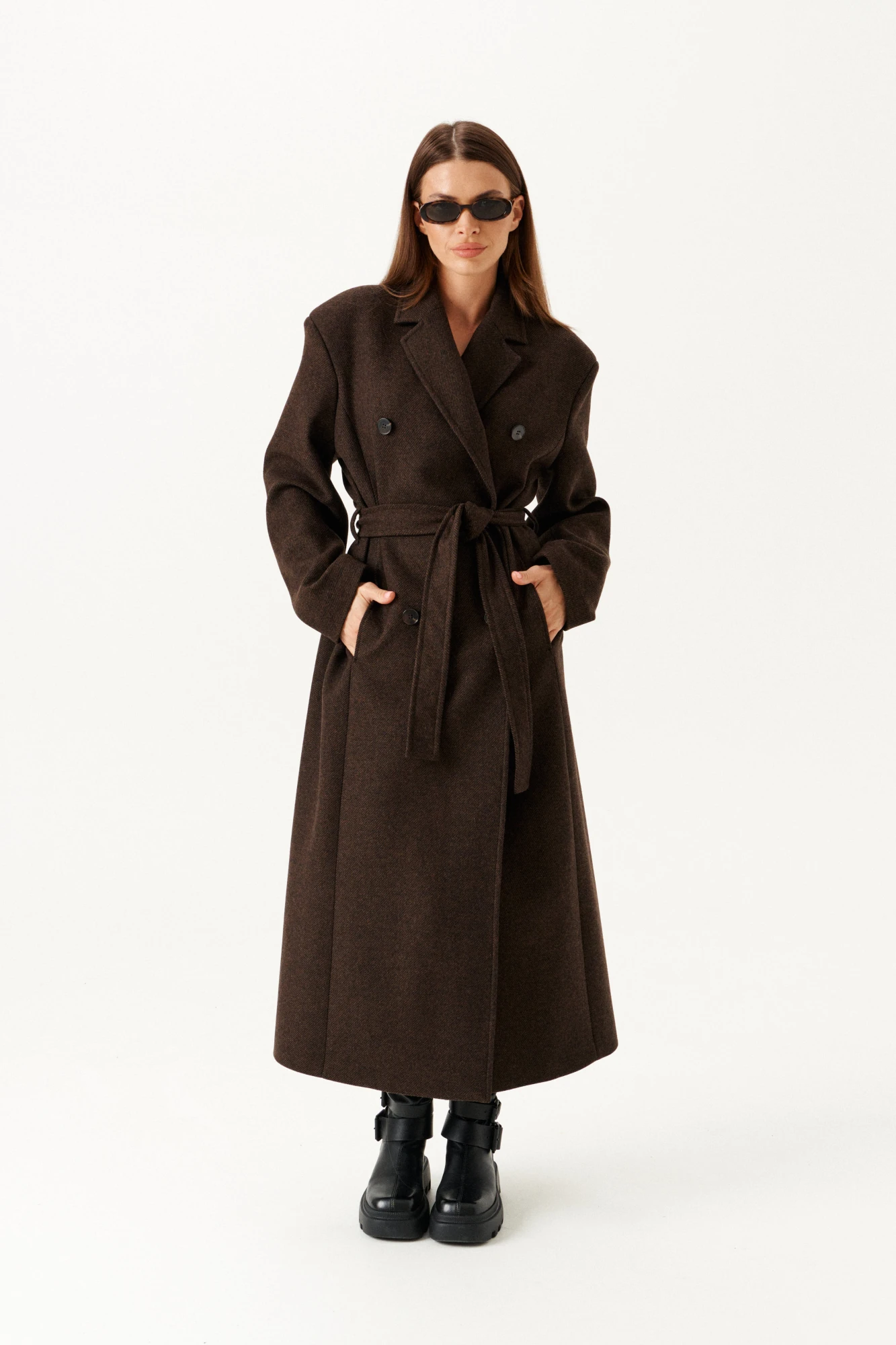 Пальто из пальтовой ткани, прямого силуэта, свободное, со спущенной линией плеча, с центральной двубортной застежкой на петли и пуговицы, отложным воротником и лацканами пиджачного типа, на подкладке. Полочки с отрезными бочками и карманами в швах. Спинка со средним швом и шлицей, с отрезными бочками и плечевыми вытачками. Рукав втачной, длинный, двухшовный. В комплекте пояс из основной ткани.