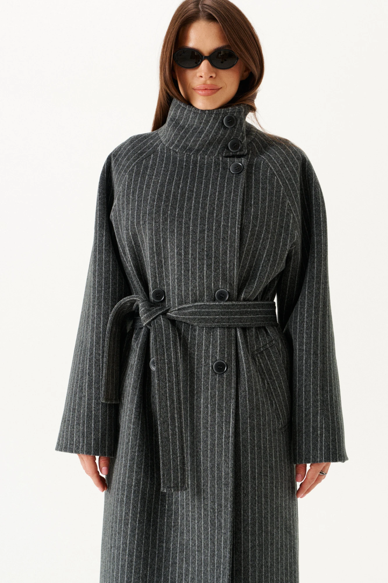 Пальто из трикотажного полотна прямого силуэта, с центральной двубортной застежкой на петли и пуговицы, на подкладке. Воротник – стойка с застежкой на петли и пуговицы. Полочки с прорезными карманами с листочкой. Спинка со средним швом и шлицей. Рукав – реглан. В комплекте пояс из основной ткани.