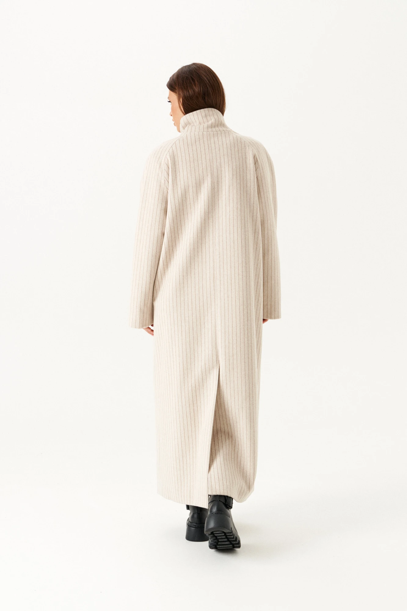 Пальто из трикотажного полотна прямого силуэта, с центральной двубортной застежкой на петли и пуговицы, на подкладке. Воротник – стойка с застежкой на петли и пуговицы. Полочки с прорезными карманами с листочкой. Спинка со средним швом и шлицей. Рукав – реглан. В комплекте пояс из основной ткани.