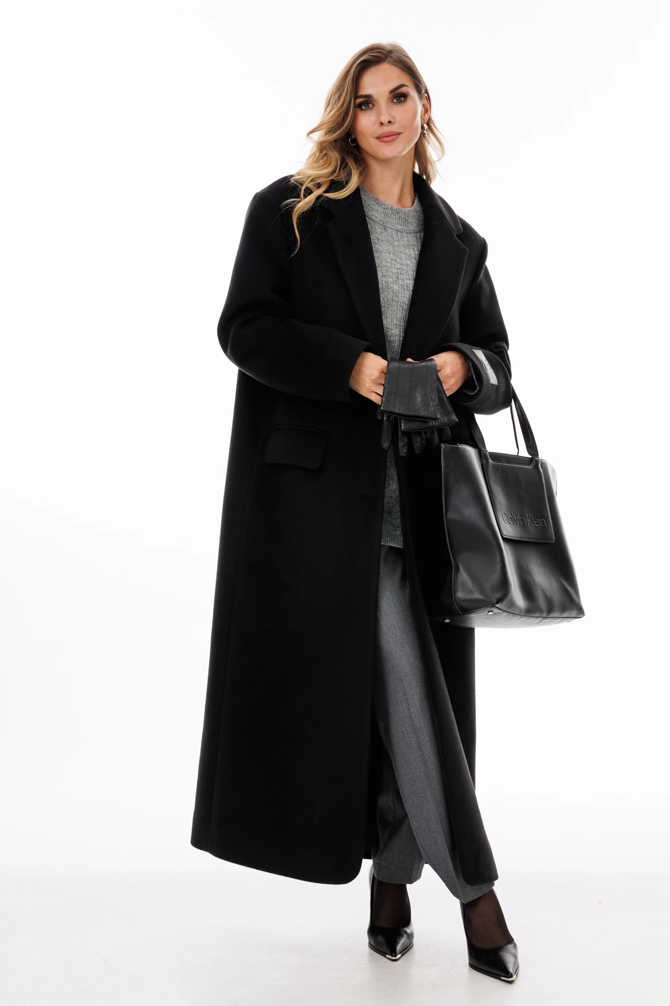 Пальто выполнено из пальтовой ткани в рубчик. Пальто прямого силуэта, длиной до линии щиколотки. Спереди застежка на две пуговицы, горизонтальные прорезные карманы. Спинка со средним швом со шлицей по низу. Воротник пиджачного типа. Плечевой шов удлинен. Рукав втачной, двухшовный. Пальто на притачной по низу подкладке. Пальто декорировано по рукаву нашивкой из натуральной кожи.
